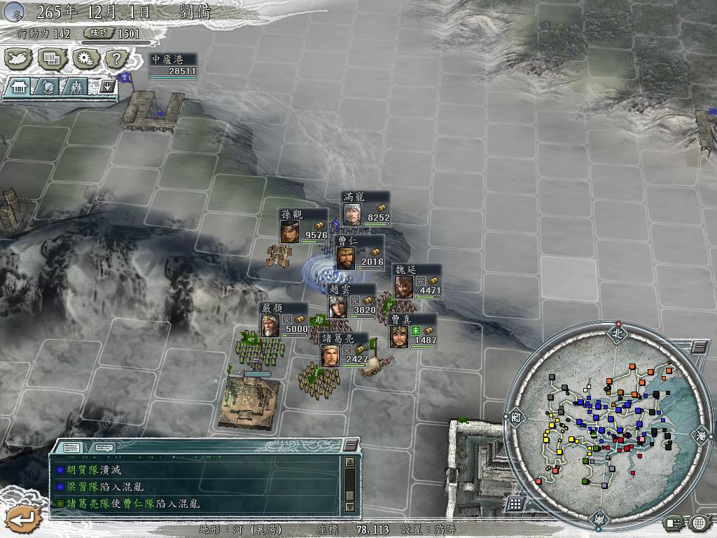 下面的江陵幸好有关羽和张飞,姜维,张苞等,不然早也破,柴桑的孙坚和永安的钟会,邓艾(刚刚被钟会灭了),武陵的金旋也是轮番进攻,幸好我抓住了武陵的金旋实力稍弱,进攻失利之时,破了武陵。开辟了第二战场,现在也拿下了零陵,(下面的赵范的势力,很弱)。现在襄阳和江陵还处于守势····