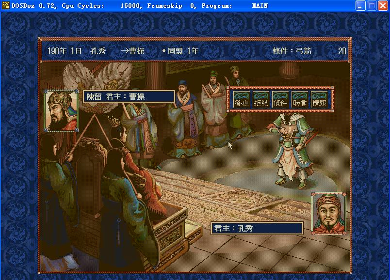 可能我这个人比较懒,在后面这几代里,外交指令基本上已是形同虚设了。所以我几乎很少看到有协同进攻、结盟等情况,而4代里即使你不去管外交,倘若你势力雄厚,自会有别的小势力跑来请求和你结盟,协同进攻等,有时还会送钱过来呢^_^。