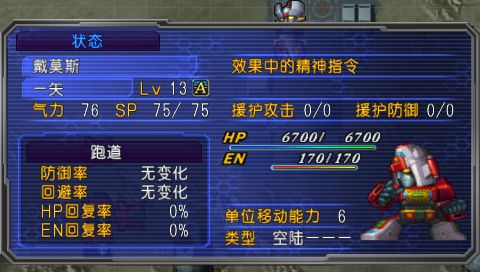 很简单的一关,戴莫斯实力强劲,本次攻略的又一支柱。有先制反击,王牌奖励又是切断100%发动,独自一人全清周围那8架杂兵完全没有问题。如果实在不放心或者说一周目没练他的话,那么退到研究所稳扎稳打好了。BOSS没有什么难点,8000血撤退,用戴莫斯加上随便一人的援护轻松击落之。另外,由于会努力的人很多,用心榨取经验值吧,以出热血作为第一目标,本关BOSS建议让一矢解决,10级出热血对接下来几关杀BOSS的帮助很大。