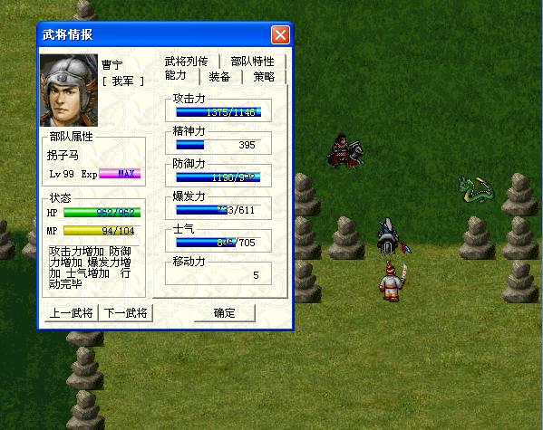 曹宁一直是我主力里的主力, 因为我比较喜欢高攻击的人物,所以象曹宁这样克所有兵种的拐子马自然成了我的最爱.