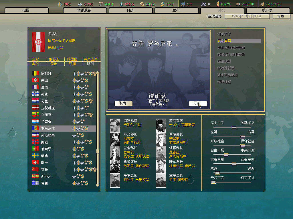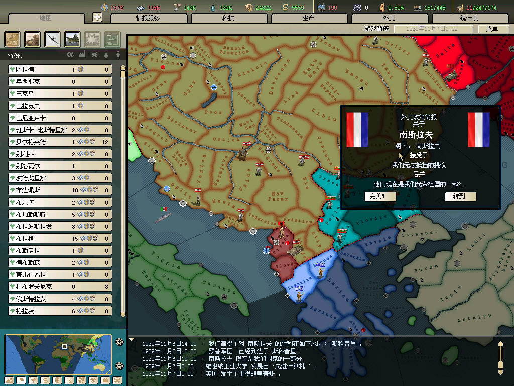 原定38年4月對波蘭宣戰,但經推演發現早戰對局勢發展不利,所以改變計劃,定于39年德國對波宣戰後再趁火打劫。一年多和平時光專心跟德國換圖紙、換資源,發展科技,擴充軍備。百無聊賴中看了看中國戰場,發現僞滿幾乎被遊擊隊切成兩半。