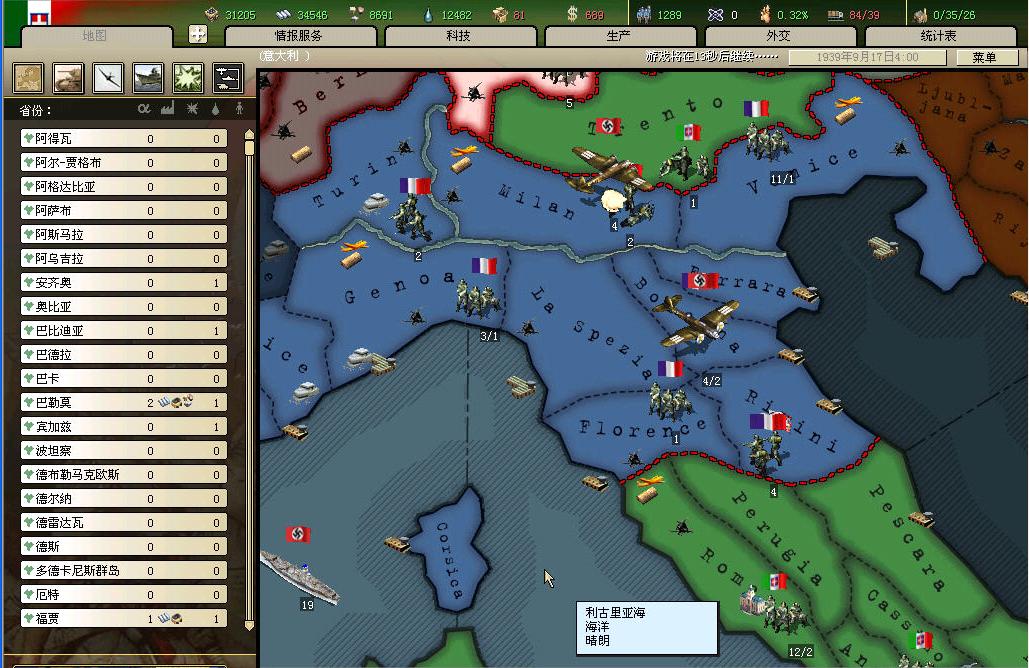 今天懒猫(意)和熊猫(德)玩联机,由于第一次联机打,研究了半天,又没有经验,还闹了不少笑话,最终华丽地在39年就破产了,截图一张,留作纪念。。。
