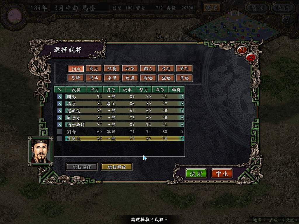武威一城,连马岱将军在内,共有七人,马岱将军、刘某人、衲子兄,以及关毛三兄弟和一位不知来自何处的神秘人士。实为巧幸,刘某人智高一筹,被马岱先山尊为军师,吾愿将毕生所学为将军完成统一大业。