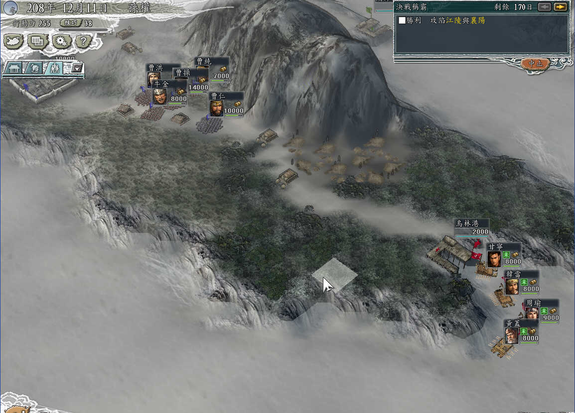 与《三国演义》诸葛智取南郡不同,正史上的南郡争夺战是周瑜攻占南郡,过程是:首先“与曹仁隔江相峙”,后来采取吕蒙之计“在夷陵打破曹仁,于是周瑜渡江来到北岸和曹仁对峙”。可见:1、周瑜围攻江陵要打水战;2、刘备没有参战;3、襄阳没有发生战斗。这些都与我们的称霸模式不同。受到正史的启发,我本想把曹军引到水里打,因为除了黄盖是楼船,其他都是斗舰(很是奇怪?),结果就无心插柳地发明了这篇零伤亡另类打法。