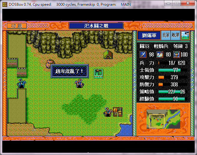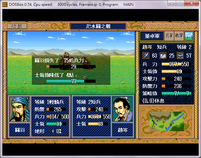 敌*宋宪开始和张飞缠斗(以下不述),弓兵1原地攻击关羽,弓兵上4休息,侯成原地攻击关羽