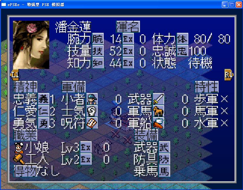 西門慶:腕/技/智 59/63/72 ;忠/仁/勇/体 79/91/88/96;全战斗适性:△/△/△ ,职业:色男