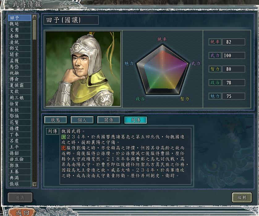 玩PK剧本魏延判汉,初期田予的武力正常,只有70多吧,没想到玩了几年电脑控制的田予竟然有100的武力,不知道是吕布附体还是吃了什么药。发誓我没有修改过也不可能给电脑武将改数值那么无聊。