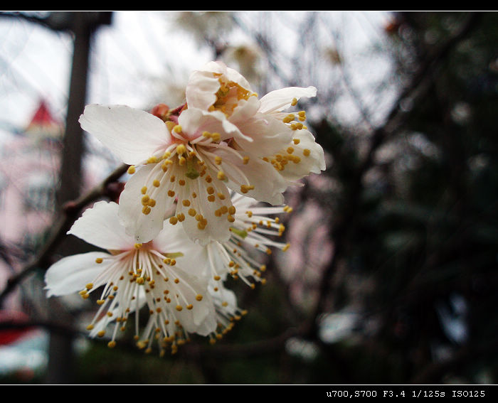 看似梅花却不似,不知是虾仁花。那个晶格状是后面楼房的瓷砖撒,镜头不奇怪吧,拍微距偶尔会有二线性。