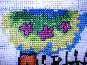 我考虑了一下觉得要是按照以前的想法,等都绣完了一起勾边,很有可能有哪部分没注意就没勾上的情况出现。所以改变了一下方针策略,决定还是从角上开始绣好了。不过其实是,左上角已经绣好一部分了,右上角几乎没怎么动,但是整个右半部分的进度要远远快于左边。所以考虑了一下还是从右上角开始好了。