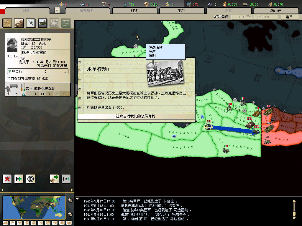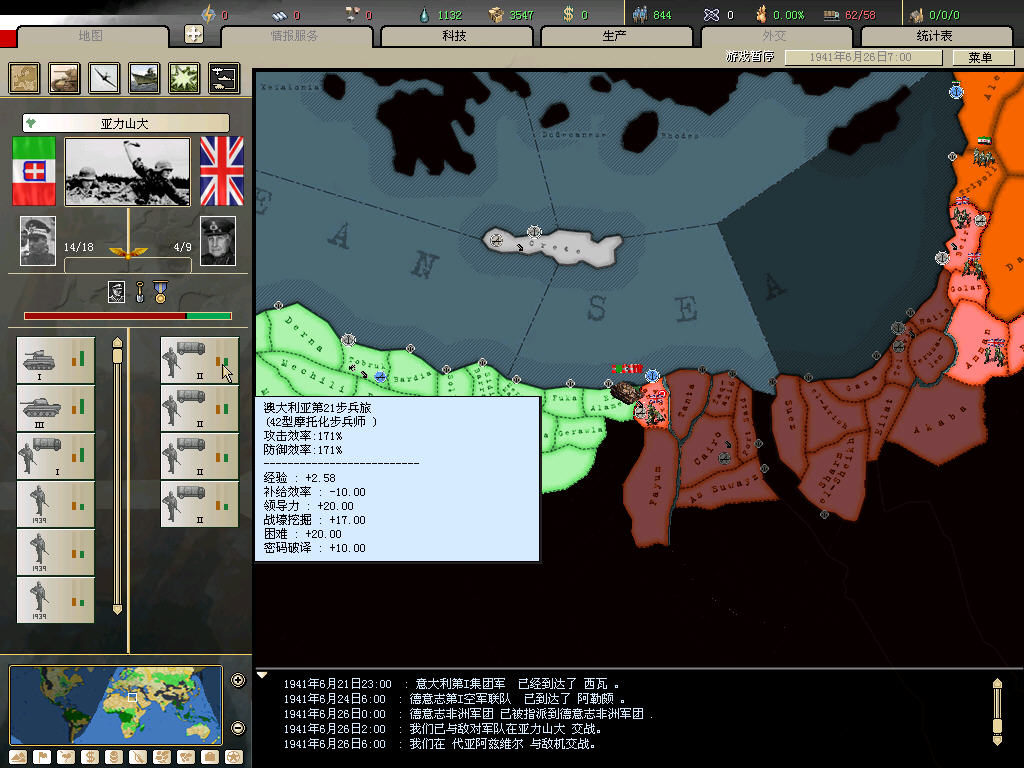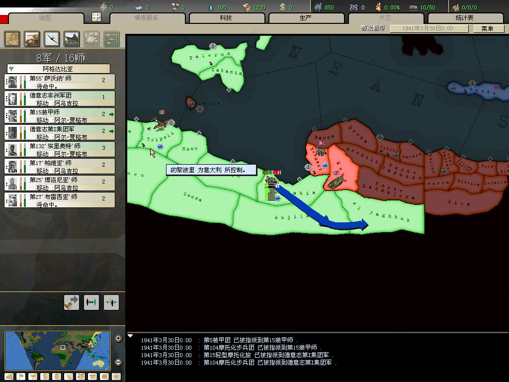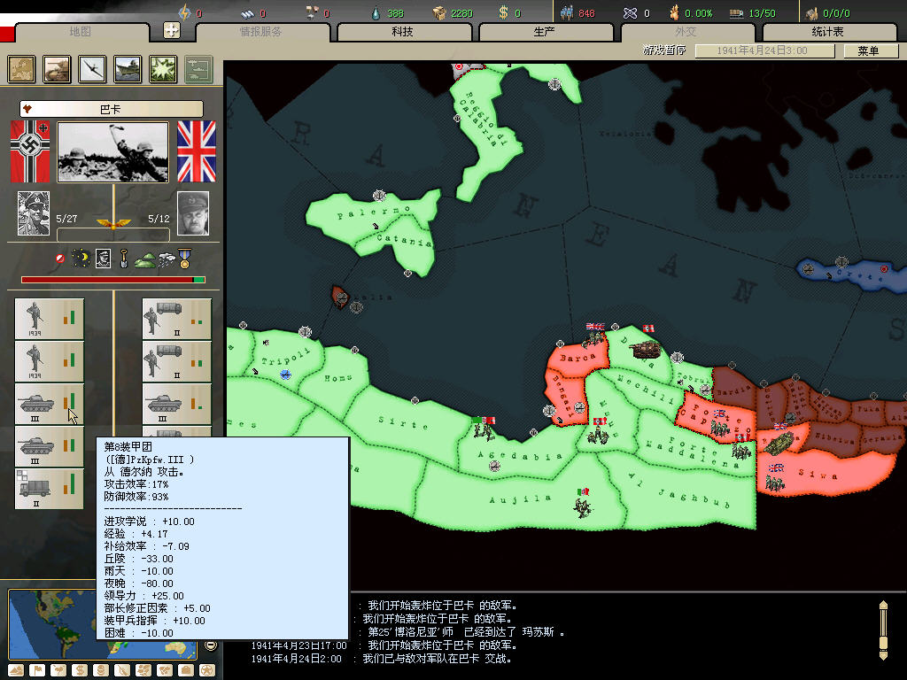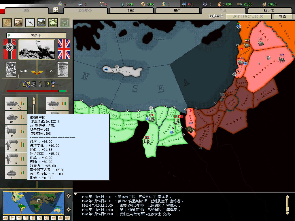 同样的北非战场,我80几个精锐师,还没加事件刷的,被英军赶下海3次。。。。。。