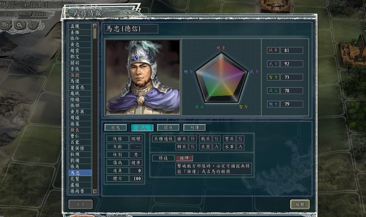 这个马忠感觉很忠厚,能力大多在70-80之间吧