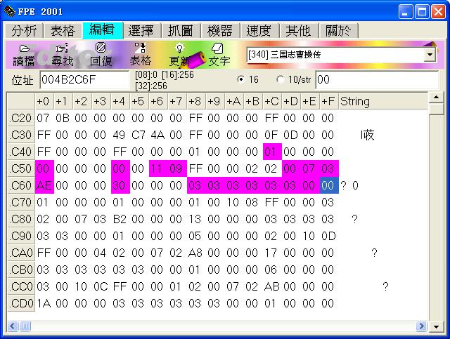 剩下的按类划分,ae-b0富豪1-3,b1-b4农民1-4,b5-ba士兵1-6,bb-bc黄巾军1-2(和貂禅一起的那两个),bd-bf侍女1-3,c0-c5文官1-6,c6赤兔马,c7马,c8白马,c9关羽首级,ca大旗,cb镜台,cc商人,cd年轻人,ce男子,cf女子,d0小孩7,d1小孩4,d2-e9步兵1-24,ea-ff弓兵1-22,(00 01)-(01 01)弓兵23-弓兵24,(02 01)-(19 01)骑兵1-骑兵24,(1a 01)-(29 01)弓骑兵1-弓骑兵16,(2a 01)-(35 01)炮兵1-炮兵12,(36 01)-(3d 01)武术家1-武术家8,(3e 01)-(4d 01)贼兵1-贼兵16,(4e 01)-(55 01)策士1-策士8,(56 01)-(5d 01)风水士1-风水士8,(5e 01)-(65 01)道士1-道士8,(66 01)-(7d 01)海盗1-海盗24,(7e 01)-(85 01)驯熊师1-驯熊师8,(86 01)-(8d 01)驯虎师1-驯虎师8,(8e 01)-(95 01)辎重队1-辎重队8,(96 01)-(9d 01)粮草队1-粮草队8,(9e 01)-(b5 01)木人1-木人24,(b6 01)-(cd 01)土偶1-土偶24,(ce 01)-(d9 01)西凉骑兵1-西凉骑兵12,(da 01)-(f7 01)黄巾军1-黄巾军30,(f8 01)-(ff 01)百姓1-百姓8.