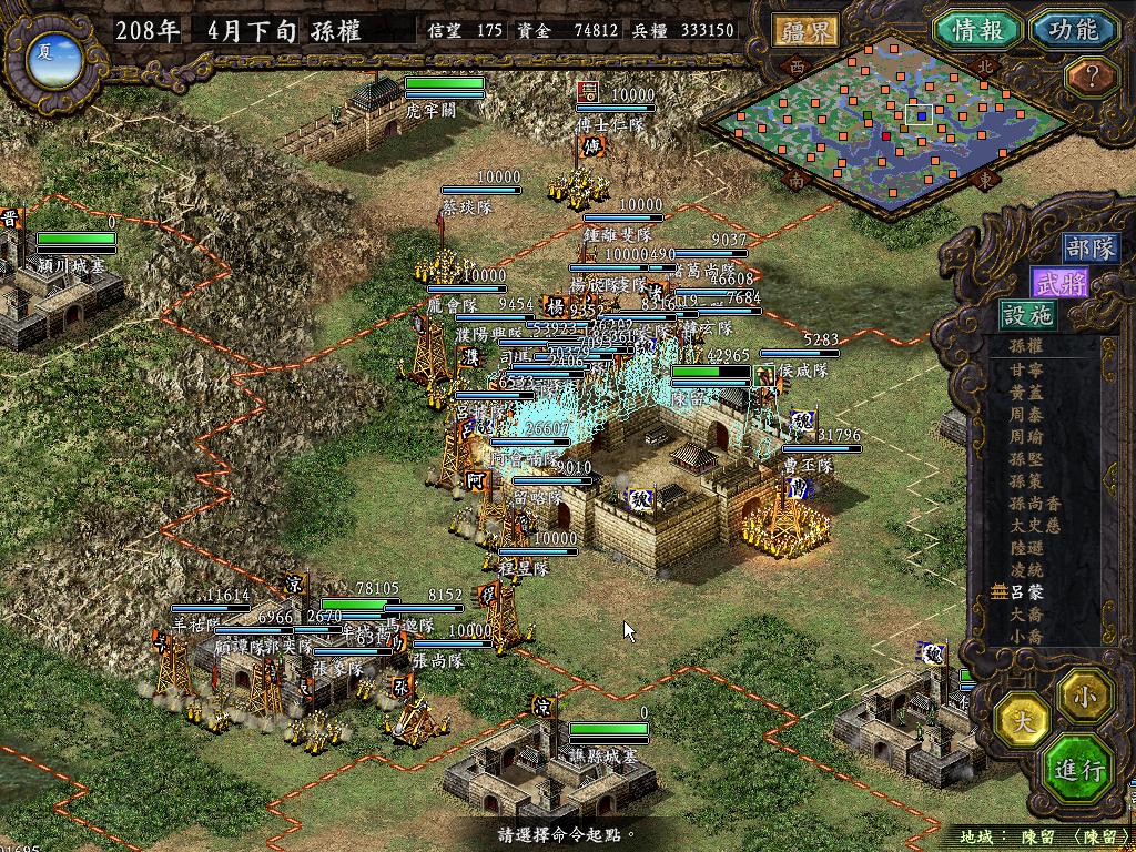 1月底前士气练满,出动25万部队去博望坡城塞,诸葛亮、庞统、姜维、黄月英各带一个3万部队以石门阵进攻宛。