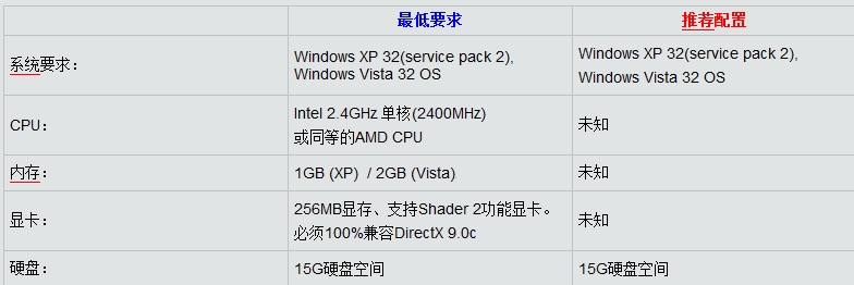 * 显卡: 256MB 兼容 DirectX 9.0c 显卡(shader 2.0或更高).