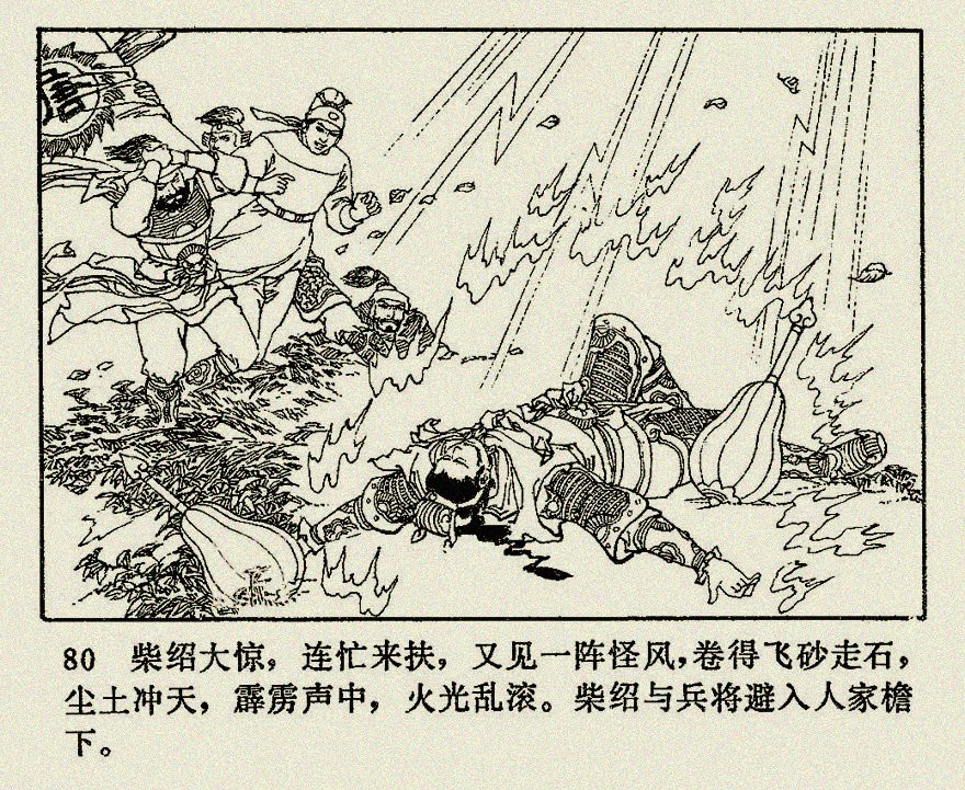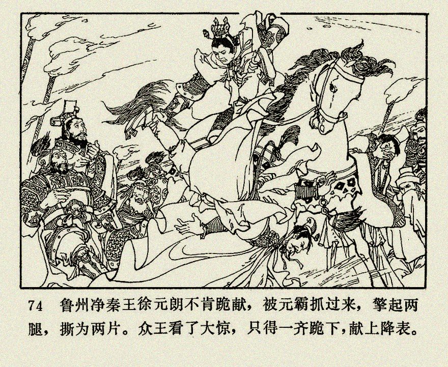 再说李元霸回到潼关,有驸马柴绍前来接应,二人遂同路而行。只见风云四起,细雨霏霏,少顷雷光闪烁,霹雳交加,大雨倾盆而降。那雷声只在元霸头上响,如打下来的光景。元霸大怒,把锤指天大叫道:“天,你为何这般可恶,照我的头上啊?”就把锤往空中一撩,抬头一看,那四百斤重的锤坠落下来,扑的一声,正中在元霸脸上,翻身跌下马米。柴绍大惊,连忙来扶,又见一阵怪风,卷得飞沙走石,尘土冲天,霹雳声中,火光乱滚。柴绍与兵将避入人家檐下。少顷,风停雨止,出来看,只见元霸的金冠落地,那双锤与马却在一旁,人已唤不醒了。柴绍放声大哭,只得殓了元霸遗体,连同他的遗物和玉玺降表,回转长安。入朝拜见高祖,哭倒于地。高祖忙问何故,柴绍具奏其事,献上玉玺,并十八邦降表。高祖一闻元霸身亡,大喊:“皇儿好苦!”晕倒在龙椅上,文武百官扶起救醒,又大哭一场,下旨遥祭重殓开丧。