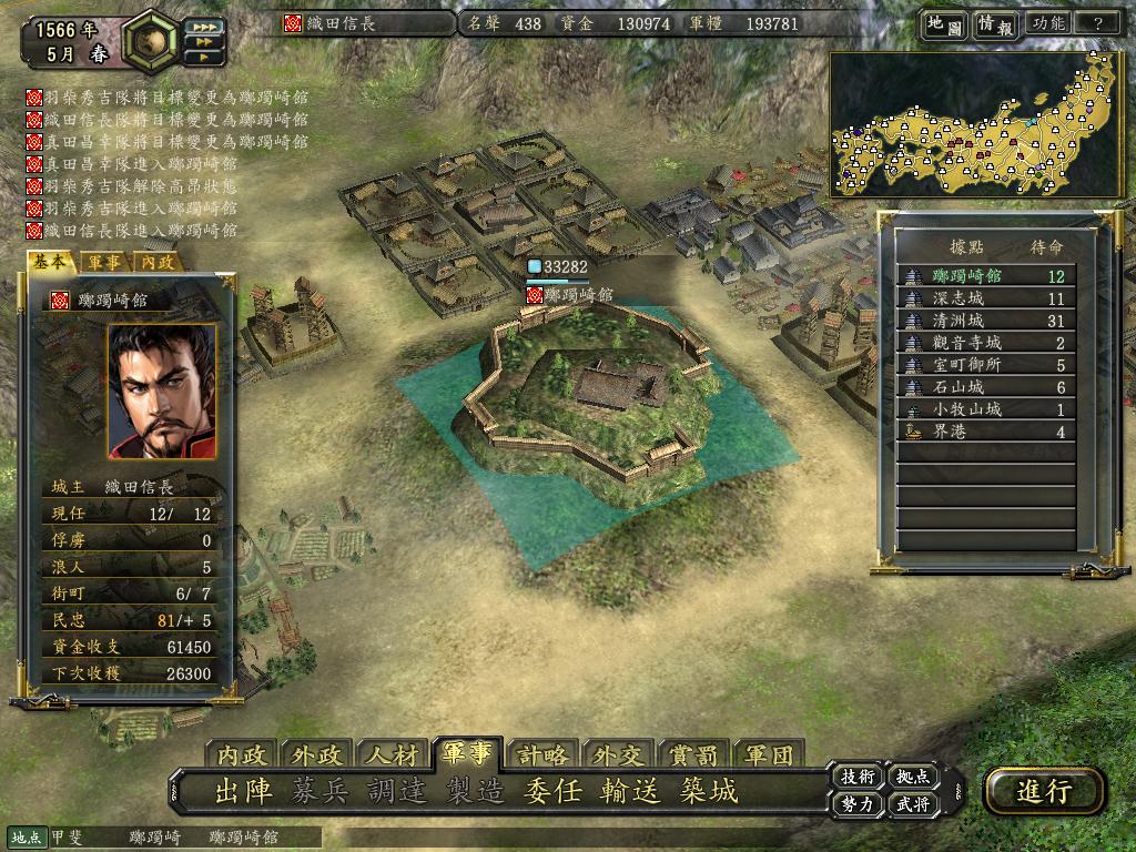 信长+兰丸+信忠三个人一起建3个町(1个商人町,1个农村,1个武家町),剩下的4个人建3个田和一个市。信长,兰丸,信忠3人回来后建几个市,前提是能保证在换季前完成。然后他3个人再去建2个职人町和1个武家町。接下来政治上40的人开足马力建铁炮学舍,其他人建市和田。市和田的建设一定要在换季前完工。垃圾们在换季前回到城里,马上流放之,就这么录用一批,每人建设一个市或田,然后又流放,免费劳动力,呵呵。