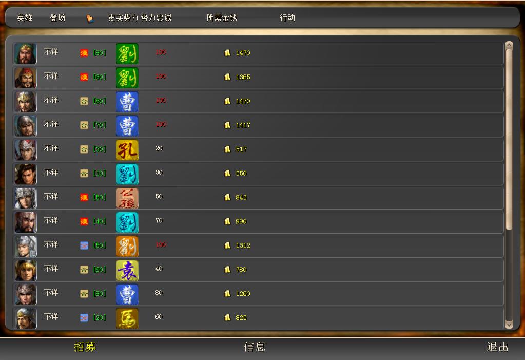 每个将领在都有一个当前所属势力以及忠诚度(有些将领比如甘宁和太史慈会按年代更换),忠诚度100的将领将直接加入相应势力,无需任何花费。同样的,只要该势力仍然存在,那么将领不会被其他势力招募(但战败投降还是有可能的),忠诚度越高,该势力招募的费用就越低,其它势力就越高