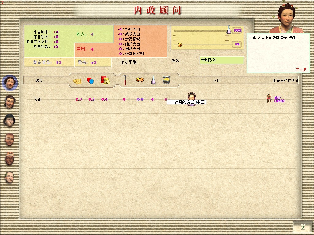 最近想玩很早以前的游戏——中国,由于这个游戏实在太古老,在我的电脑上运行一千多年肯定要弹出,中途弹出更是不计其数。于是便找替代品——文明系列。搜索下载,开始是想玩文明2,估计能古老一点,但没一个能下的,下到一个文明3,因为以前虽然稍微玩了一下,但几乎可以说没玩过,所以摸索一番终于学会了。至于文明四,以前也稍微玩了下,现在没找到下载,总之就先玩这个文明3吧。
