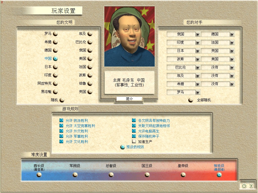 回wotaifu :其实所谓的神级难度,对绝大多数游戏来说,恰好是玩家最应该选择的难度(也有少数类外)。比如这个文明3,初玩的人可能会觉得电脑太作弊了(事实上没有作弊,但估计他们一开始就是每个城支持2个或4个人口为满足,至于其他的,制作游戏的人一般还不屑于靠作弊来取胜),太牛逼了,其实,按我的体会,制定神级规则的人,还是太仁慈了一些,因为几乎在公元前后之前,你只需要一个武士就可以大致保证国家的安全,只要你不去过火的招惹电脑。这种好事大概到公元3世纪前后就没有了,电脑会来打你了。不过,这时我们早已有骑兵(早在公元前2000年前后一出车轮就有战车,绝对可以打赢任何防御战了,进攻会麻烦些,这玩意不能通过森林和山地),即便你不擅长经营,单靠玩家的个人AI(利用下地形什么的),完全可以吃死电脑,乃至抢他们的城市和奇迹之类的。