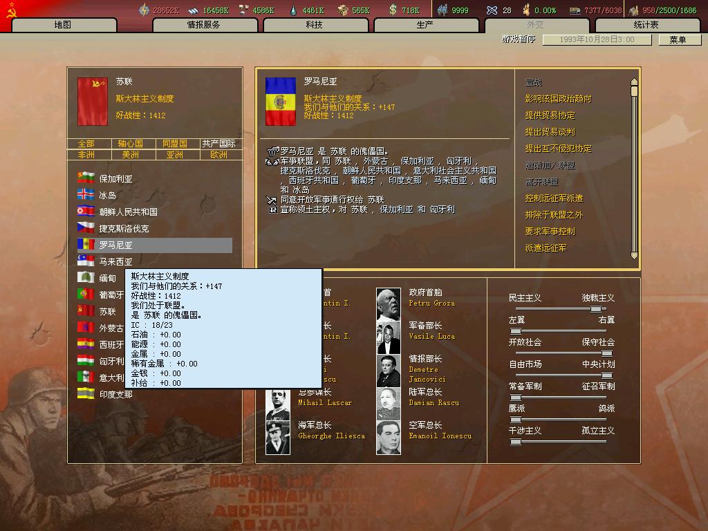 选1936年苏联,经过数十年的战斗,终于把红旗插遍全球,除了几个东欧盟国,其他全部吞并。我的IC达到2500,养2、3千个师很正常。可罗马尼亚只有18IC,居然养了185个师?!