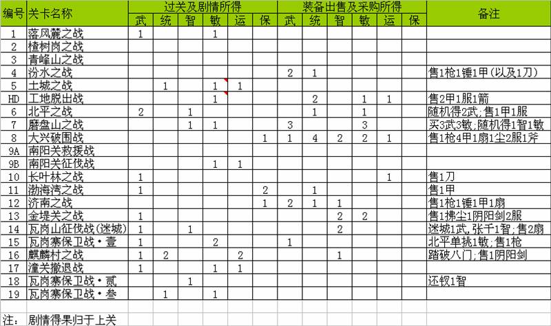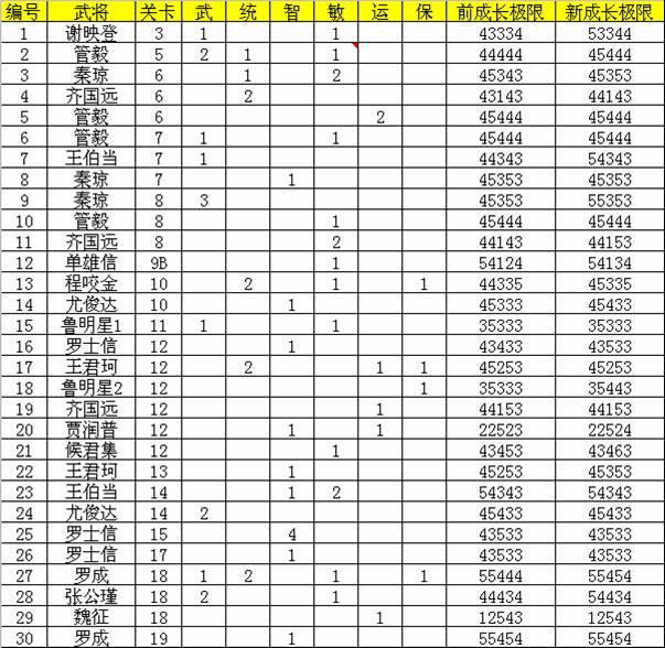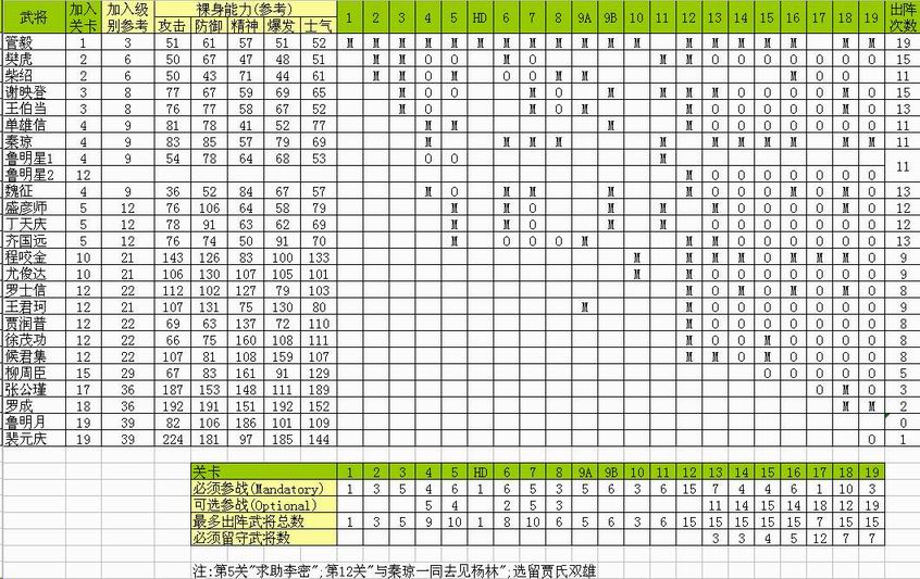 "武将列传"子表: 一看就明白了,里面有一个有用的信息是,谁,在哪一关可以出现;