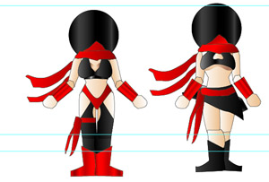 5、上好矢量模型的色彩之后,我们的形象可以说就完成了一半左右了。但是我们的模型这个时候“身材”还很大,我们最好把一个现成的形象文件置入进来,并且也锁定上。之后用辅助线定好人物的高矮。这样我们就可以吧我们做好的模型也改成形象的实际高矮了。这个时候矢量软件的优势出现了,就是缩放和形变不会出现马赛卡的虚边。如果发现形变后边线粗的很难看也不要紧,在上一步,我介绍过我们可以修改边线的粗细。只要改成最细的就可以了。