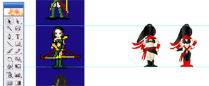 8、这个时候,我们把矢量图像编程像素图像的工作就完成了。但是大家一定对这个结果不满意,因为计算机默认计算出来的样子和我们希望的形象还相去甚远。这也是本人这个方法最大的弱点,就是精细程度不足。为了弥补这一缺陷,剩下的没有别的好办法,就只用点绘了。但是我们已经把一个人物的70%都一次成型了,有些颜色简单的形象,再次润色的工作量会更少。由于前期在矢量软件里吧人物动作都编排好了,所以即使导入后有点绘的成分,工作量也会大大减少。本人计算过,用这样方式可以大大节省形象制作的时间,只要软件使用数量,10分钟之内就可以完成人物3个主要试图的模型建立。而且其余动作摆设起来基本就跟活动布娃娃一样方便。