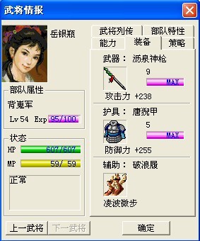 如果选女兵,建议武80统90智100敏90运90,武力果富裕的话,将武力吃到100,神话线后期这样的yyp拿双锏就是神一样的人物。