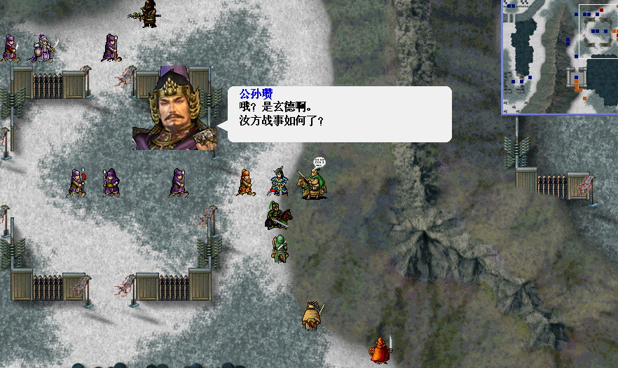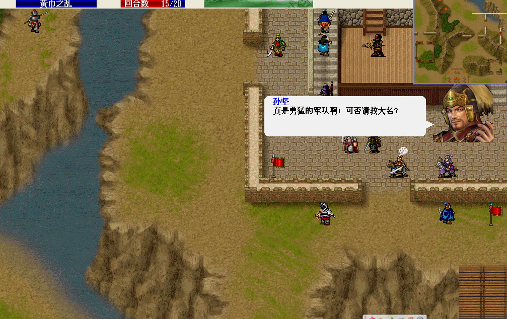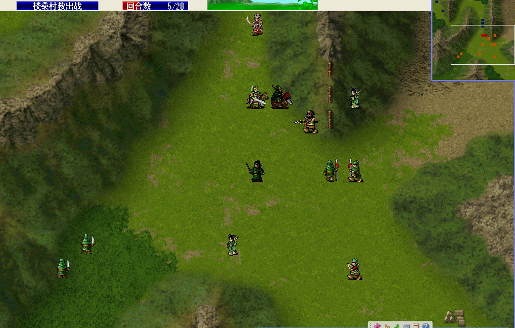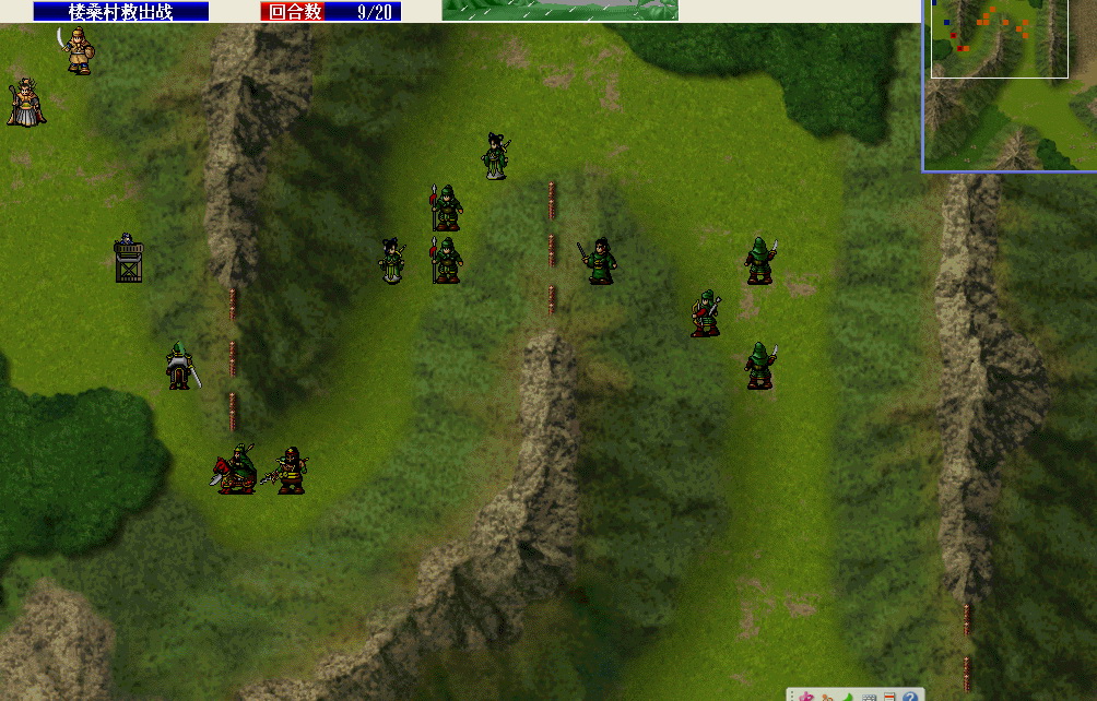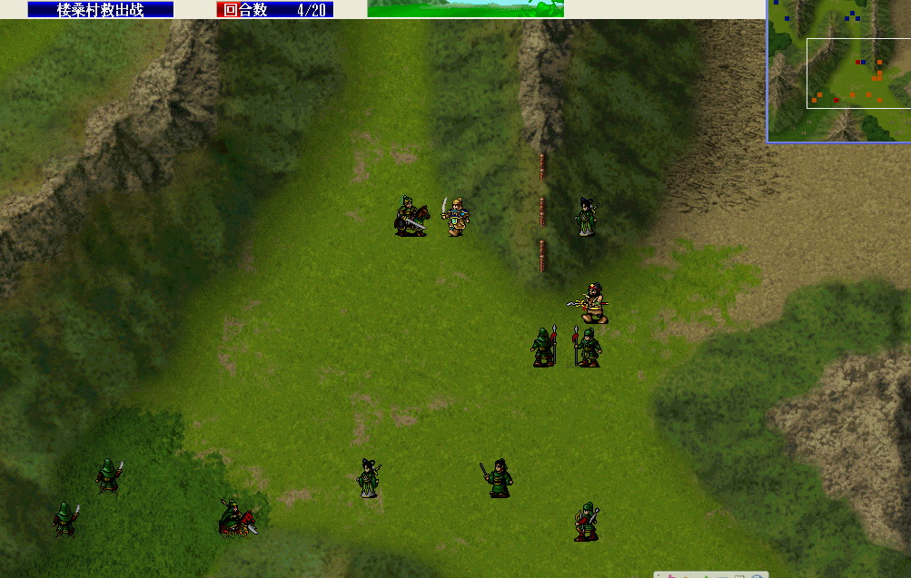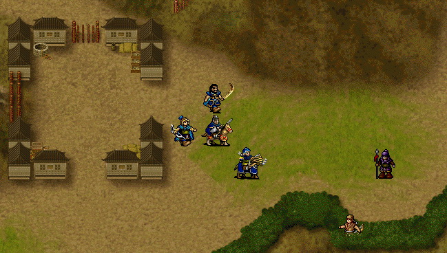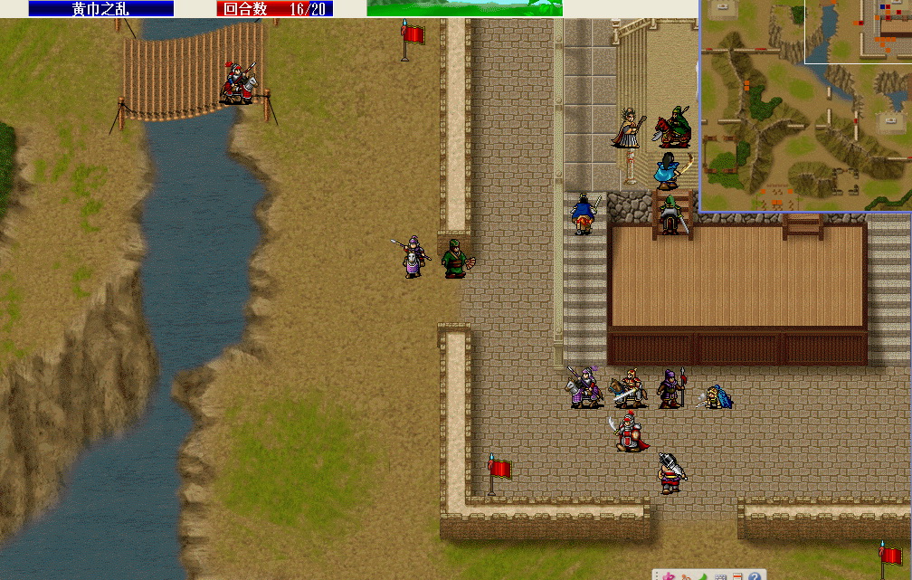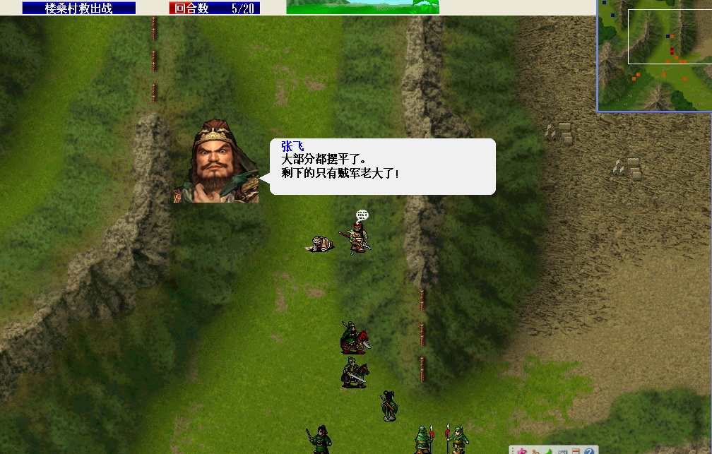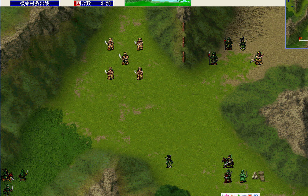 充分利用首轮可以存档,两百姓分别给关羽吃猛虎和疾风加攻加敏,女兵向左一格避开高升,关羽双击波才(敌方回合反击击退)。刘备霸气村长回归刘备,刘备双击严政,女兵将其击退,另一女兵向上卡位并取得药材。友军回合张飞击退管亥,敌方回合反击击退程远志。上方村庄解救成功,同时出现两个友军枪兵,这两人要好好利用,后面会起不小作用。