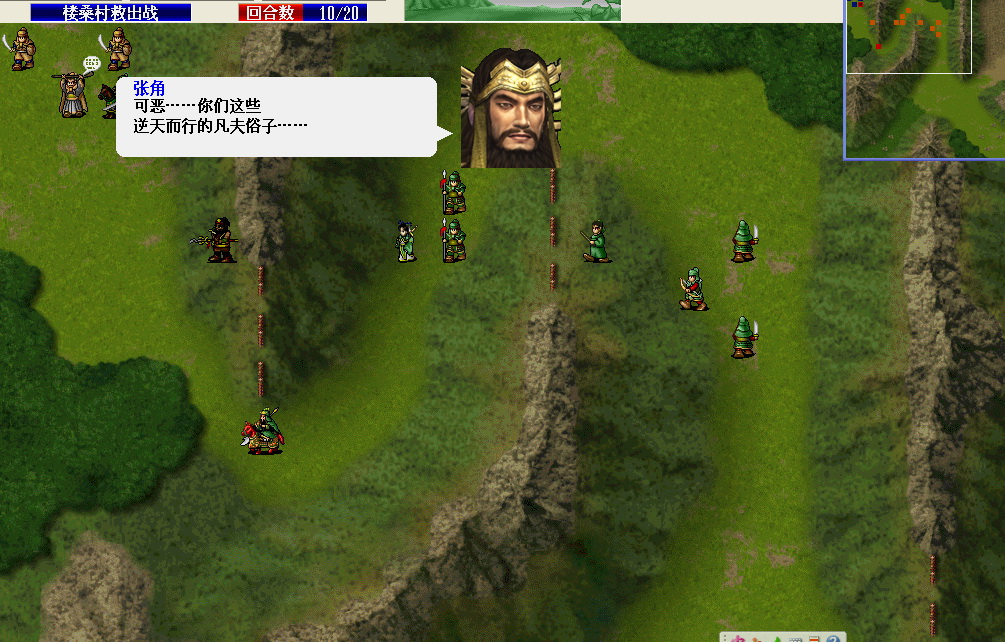 第三回合,关羽击退高升解救村庄,出现2友军。刘备与村长的回归配合早于第二回合就击退张曼成解救村庄,同时出现1友军。三个村子全部解救,敌军多了2个,同时提示贵重品位置(随后给出)。此时张飞和下方女兵的位置分别有矿石和药材。村长继续回归刘备。敌方回合张宝、张梁出现,邓茂出击。