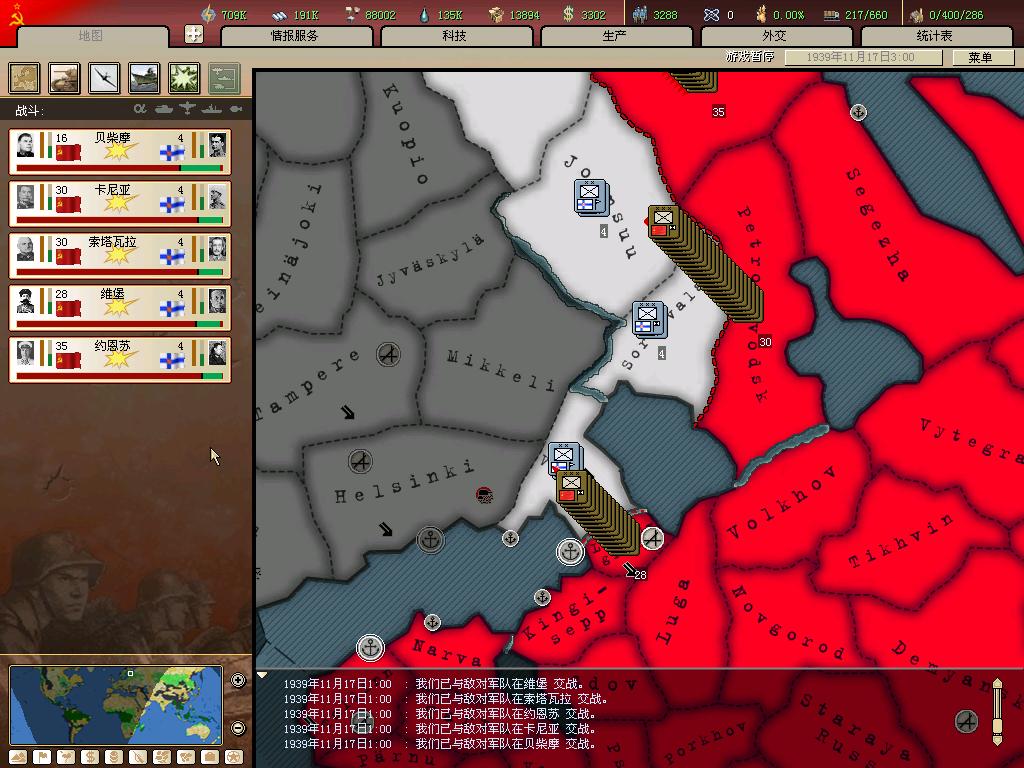 红军迅速深入芬兰内陆,英法等帝国主义国家领导的国联宣布苏联为侵略者,并开始为苏芬战争进行斡旋。但是考虑到如果此时接受芬兰的讲和,芬兰会在41年德国发动巴巴罗沙行动时加入轴心国作战,那样的话,苏联就必须在苏芬漫长的边境线上至少留下40+个师,这对于正面战场上想当吃紧的红军来说是不能接受的。现在,和英法美妖做买卖的好处显现出来了,虽然和英法等国关系破坏严重,但还没到-200的冰点,盟国不会因为一个小小的芬兰而向苏联宣战。次日,苏联宣布退出国联,红军继续向芬兰内陆的纵深挺进。