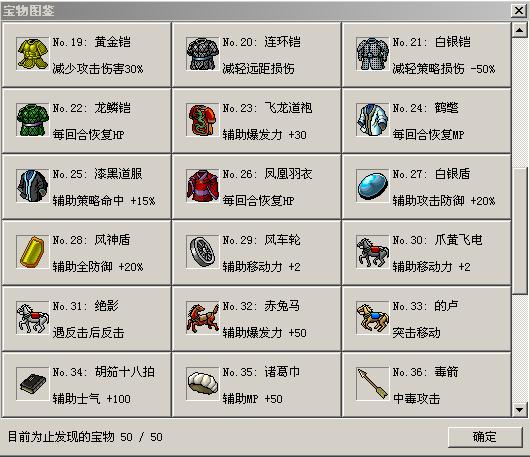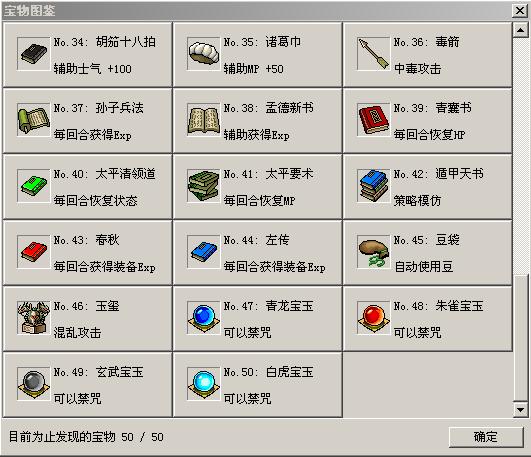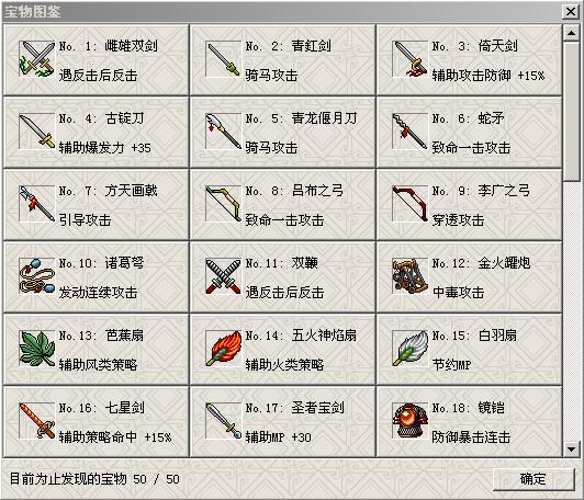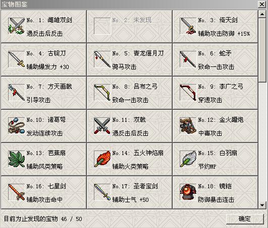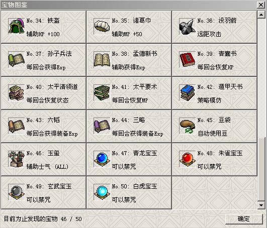 宝物图鉴见下图(缺的四件宝物是:青虹剑(攻击伤害+60%)、凤凰羽衣、两匹马)