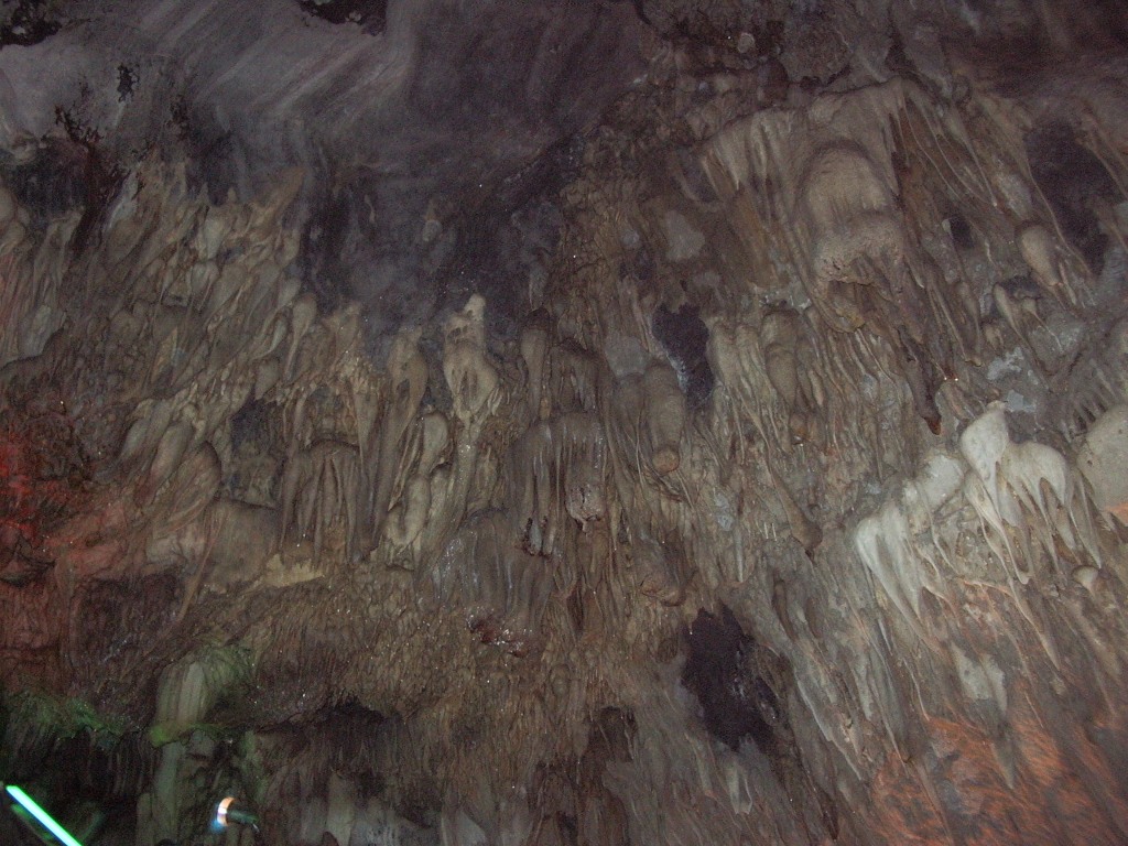 这种是打闪光灯的,出来就是这样,闪光灯就像照妖镜,把真实情形照得一览无遗,石头又现出石头的原形了,我想要的是溶洞泛光灯下的五光十色。我同事相机不知道是防抖特别好还是怎么的,一样菜鸟情况出来效果特别好。