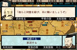 すなわち、他の戦国ゲームの様に、作業的なマス埋めを続けて統一するだけでなく、統一までの過程や、権力者との駆け引きを最後まで「嗜む」事が可能です。この事は、自ら統一するだけがプレイ方法ではなく、武家として、武士として、自らの美学に沿った「楽しい負け方」もありのゲームである事を意味します。