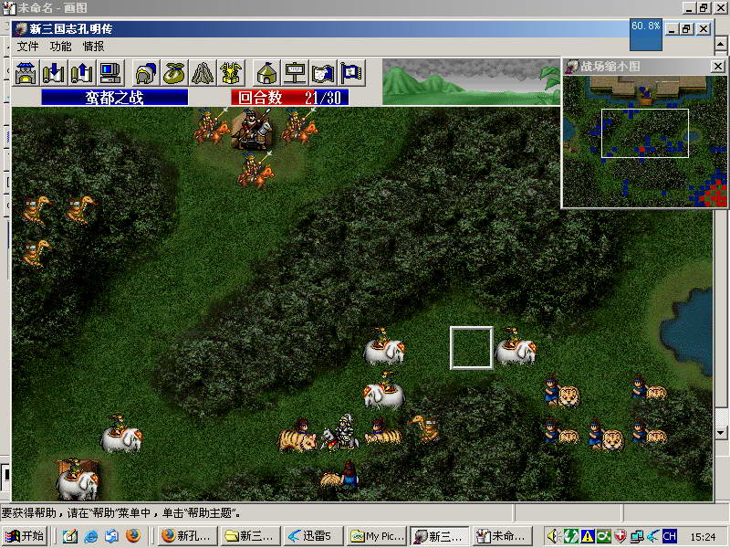 冲的时候注意卡位,如果被混就SL。我走的路线是先向木鹿,当冲到拦路的象后面时候迅速杀向孟获!无需杀木鹿!孟获被攻击是不会跑滴!杀的过程中保持加攻吃果子,我没统果没得吃。