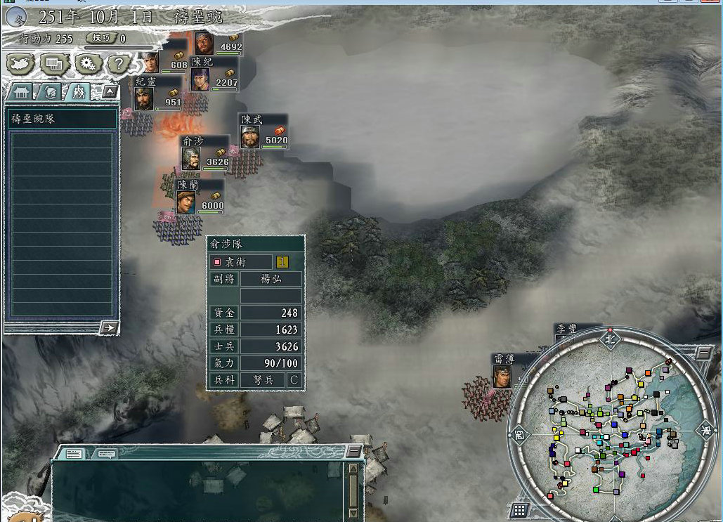 于是我重新开局,江夏留10000人,还是先研究技能后,第二回合就运输队发并巫县港,在4月11日,经过江陵的下方的时候,刘备停战23月,于是,运输队赶紧回头,留在夏口港。6月21日抵达峡口港,7月研究筑城。8月1日发并经过刘备的港口往襄阳去,8月中旬左右,夏口被孙坚占领,期间贼兵出现,会和孙坚混战。寿春的毋丘俭和庐江的袁术混战,可能会漏进一两个部队进攻江夏,但是因为江夏10000人,可以支撑很久,大约9月底这样,孙坚另外进攻江夏人马出发,这个会从水上进攻,不过江夏都可以很稳的支撑到251年的12月。