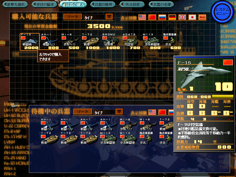 我改制了界面和设定,中国成为可以选择的一国,原来的美海和美空合并为美国(源于mf48的经典高分攻略的推荐),除中国的新加入武器,其他国家武器遵循原设定没改。