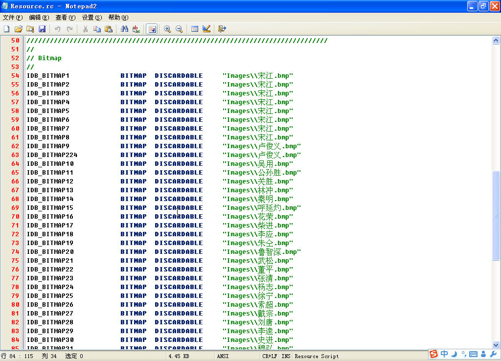 5.我建议在源文件目录下面建一个images文件夹,然后把头像都弄进去,用记事本打开源文件目录下的resource.rc(下图我用的是notepad2,蛮好用的,系统自带的也可以),在这里面改,注意这里面的IDB_BITMAP后面跟的数字应该和RPGviewer里face.e5的序号对应,右边是头像的相对路径。