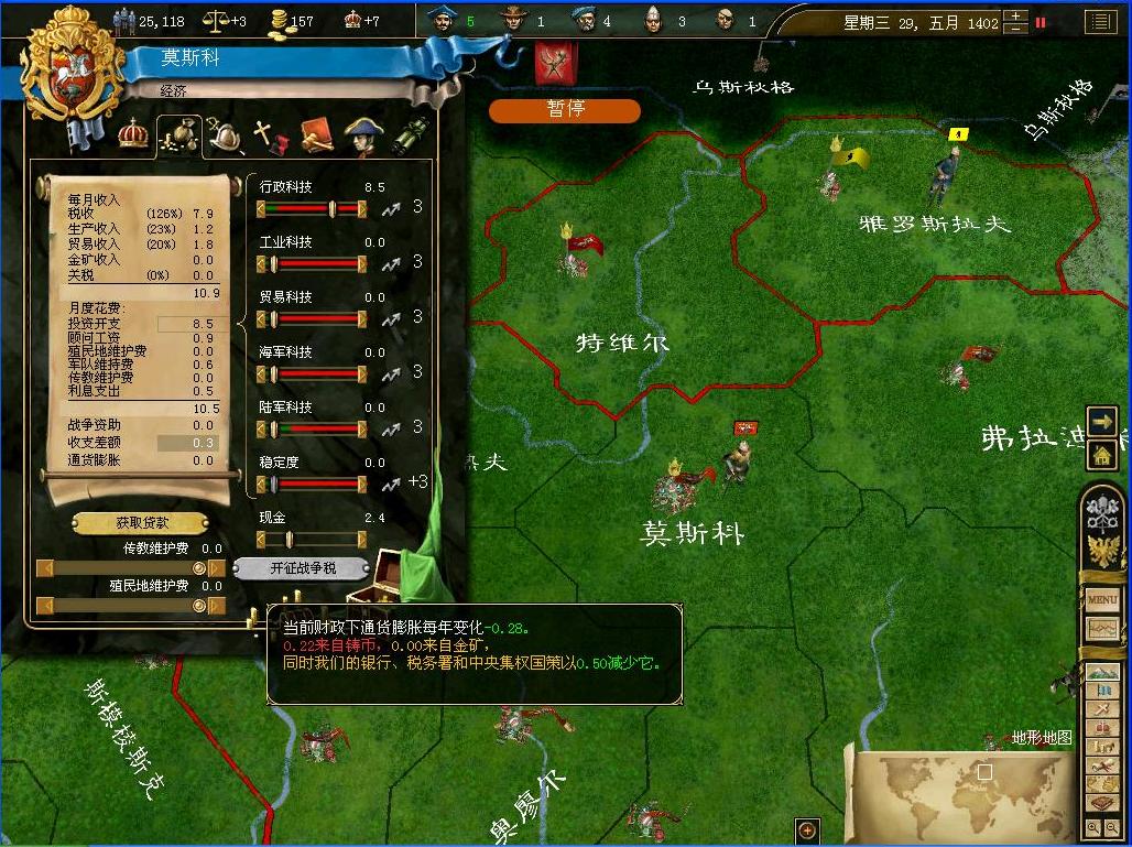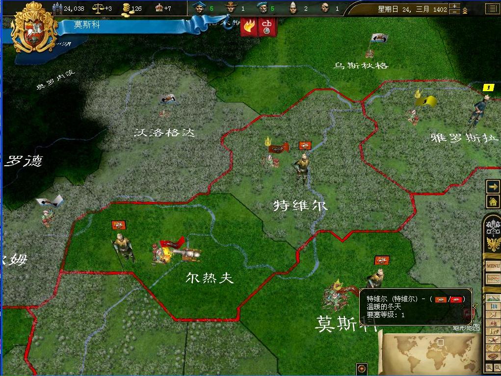 终于,在1402年5月,经过100多天的围困,尔热夫终于被攻破了,威尔特全境解放.可惜的是,因为威尔特并非自会有首都一个省份,所以这次不能吞并了,只好忍痛只要求其割给我1块地,另外给我25金币.等着,我们5年后还会来的