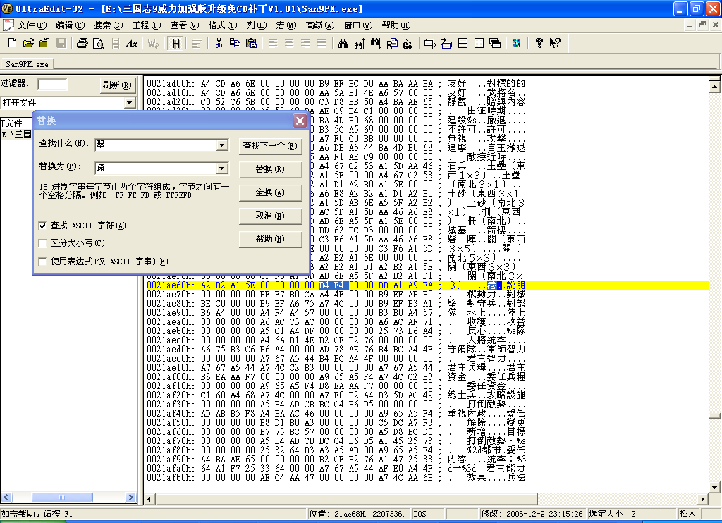 解决方法就是使用ULTRAEDIT打开exe文件比如San9.exe 或者San9PK.exe,然后设置16进制字体为BIG5字体,这样右侧就可以显示繁体字,打开替换对话框,然后使用游戏拼音输入法或者其他可以输出big5码的输入法输入对应的繁体字,注意,字长要一致,然后选择替换,再保存文件即可。