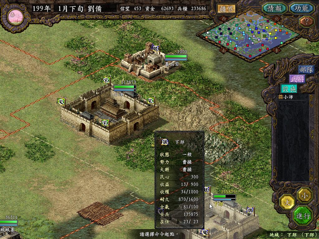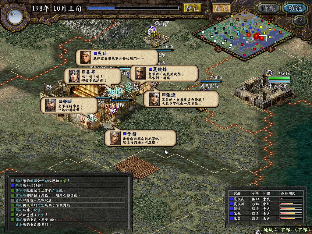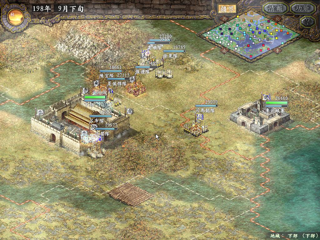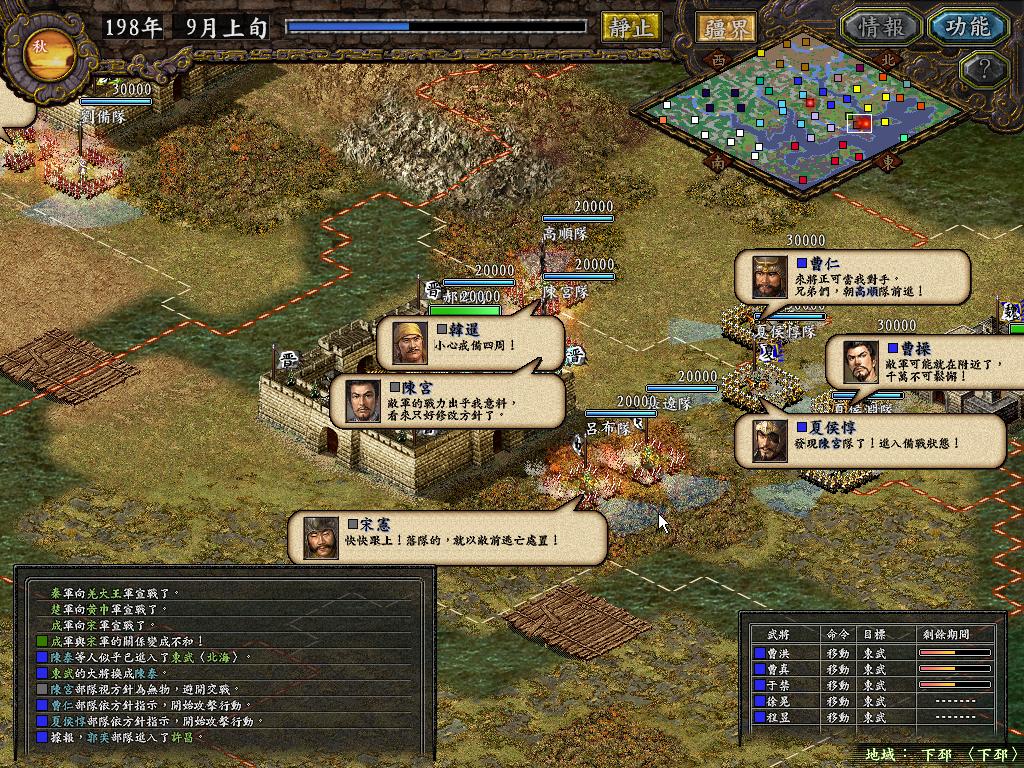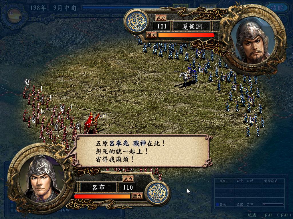 开始只选吕布,从198年9月上旬开始,就把刘备、曹操势力变为俺来操控,