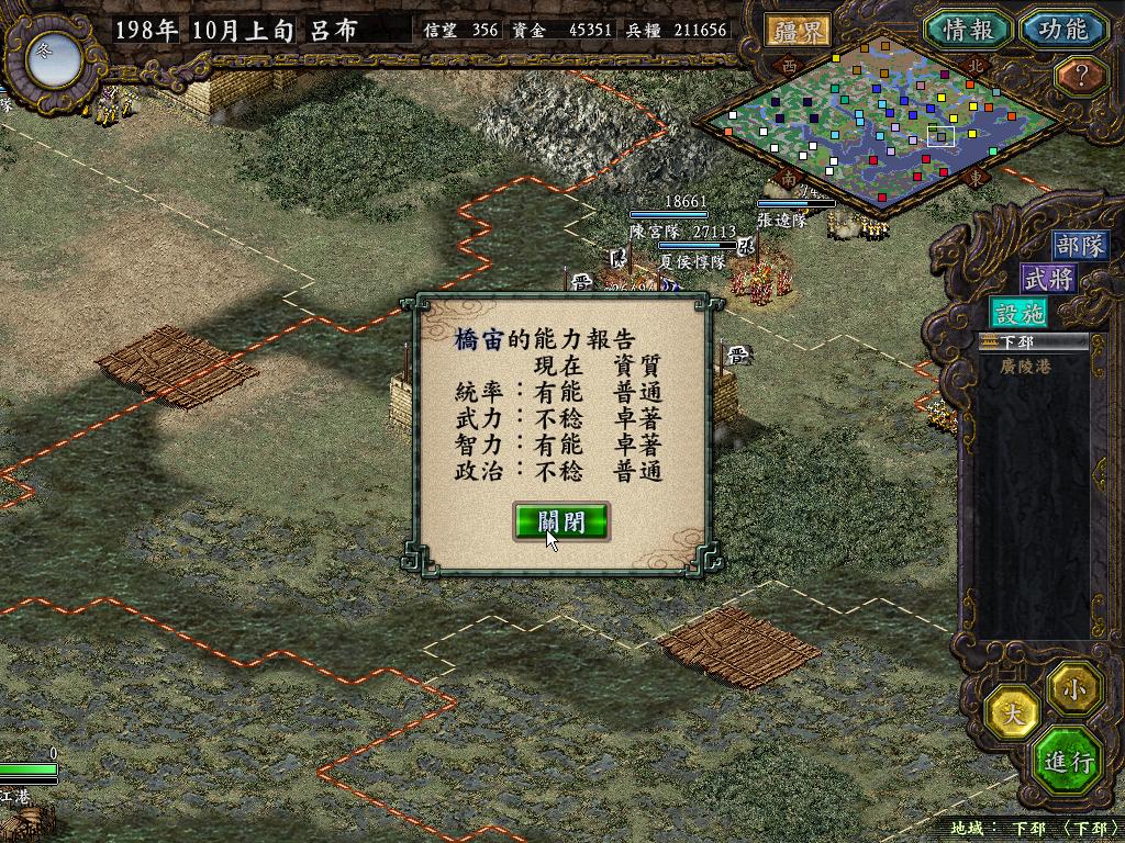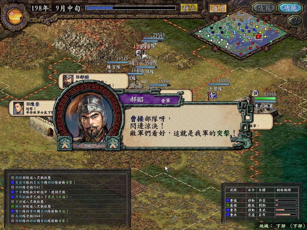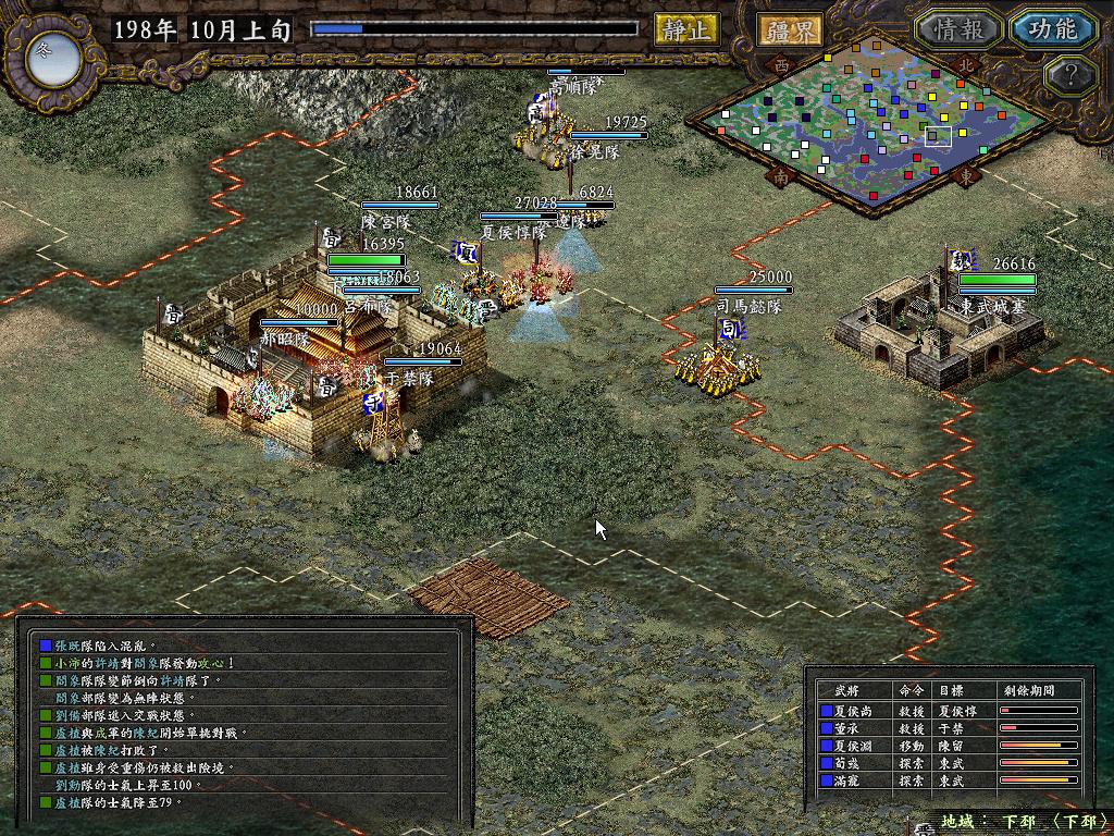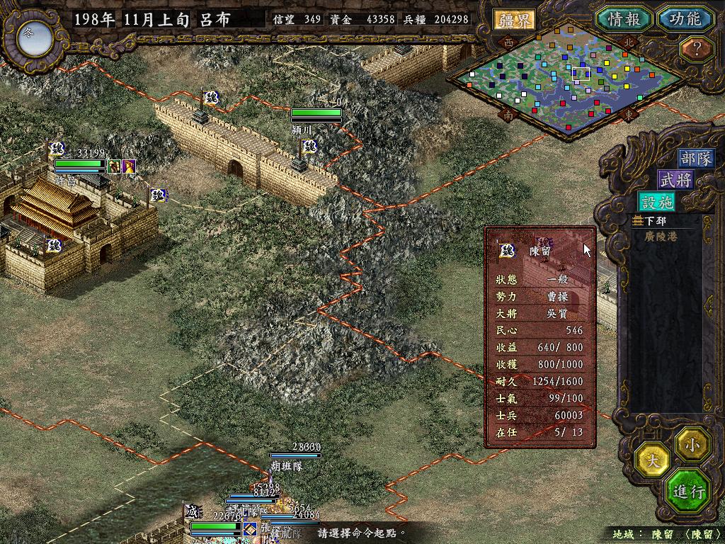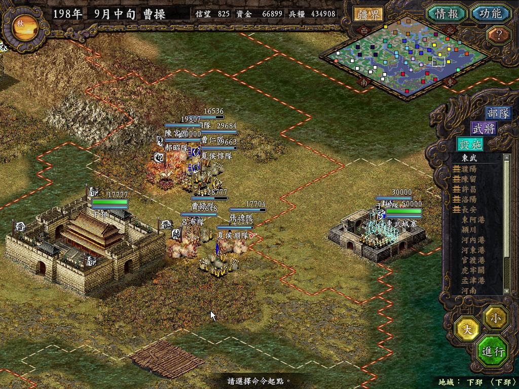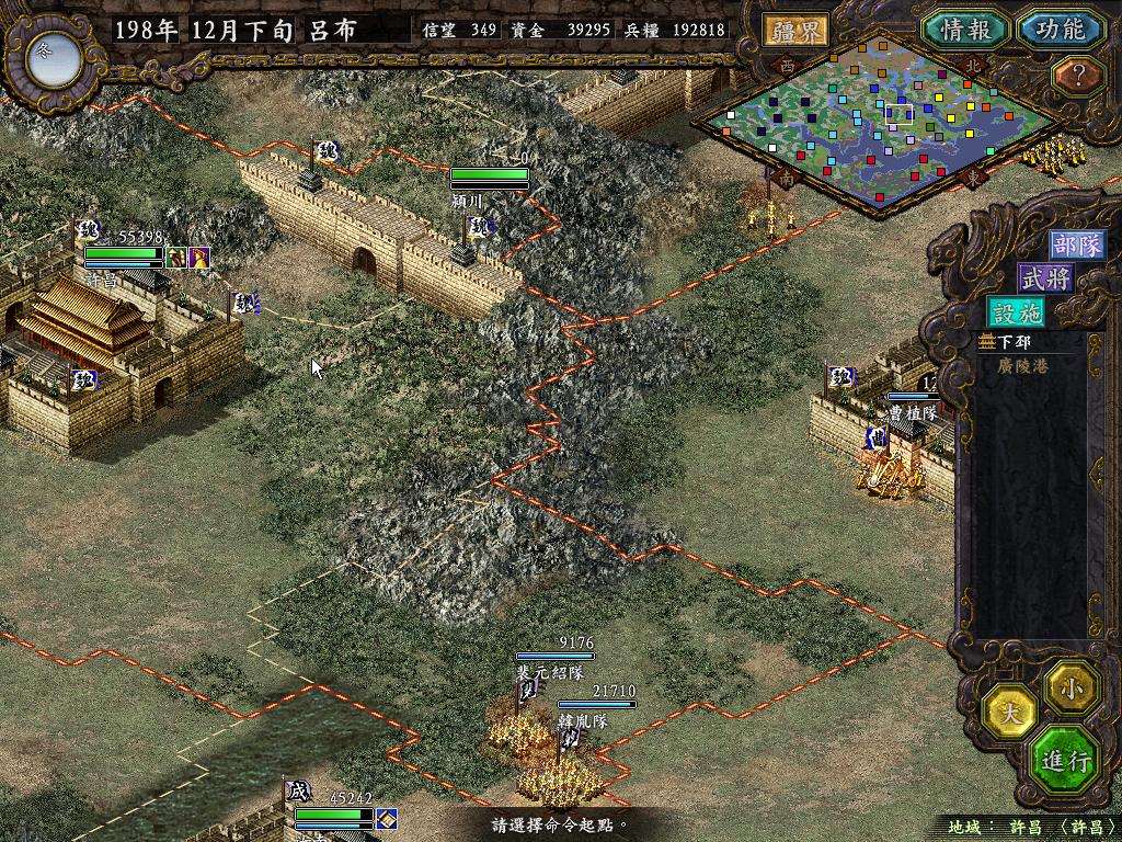 3、曹操方面,由于只对袁术和吕布交恶,而且内部有很多地方是安全的,所以将内线的兵力外调到前线,为了利用时机尽快灭掉吕布,再抽调强将前来东武进行灭吕之战。