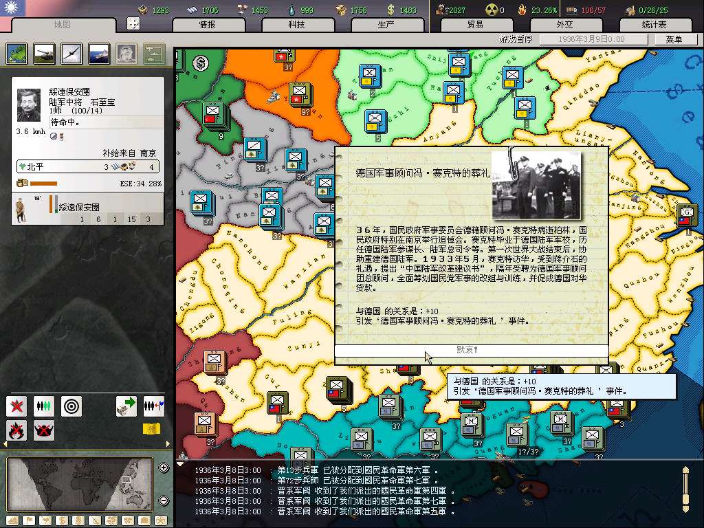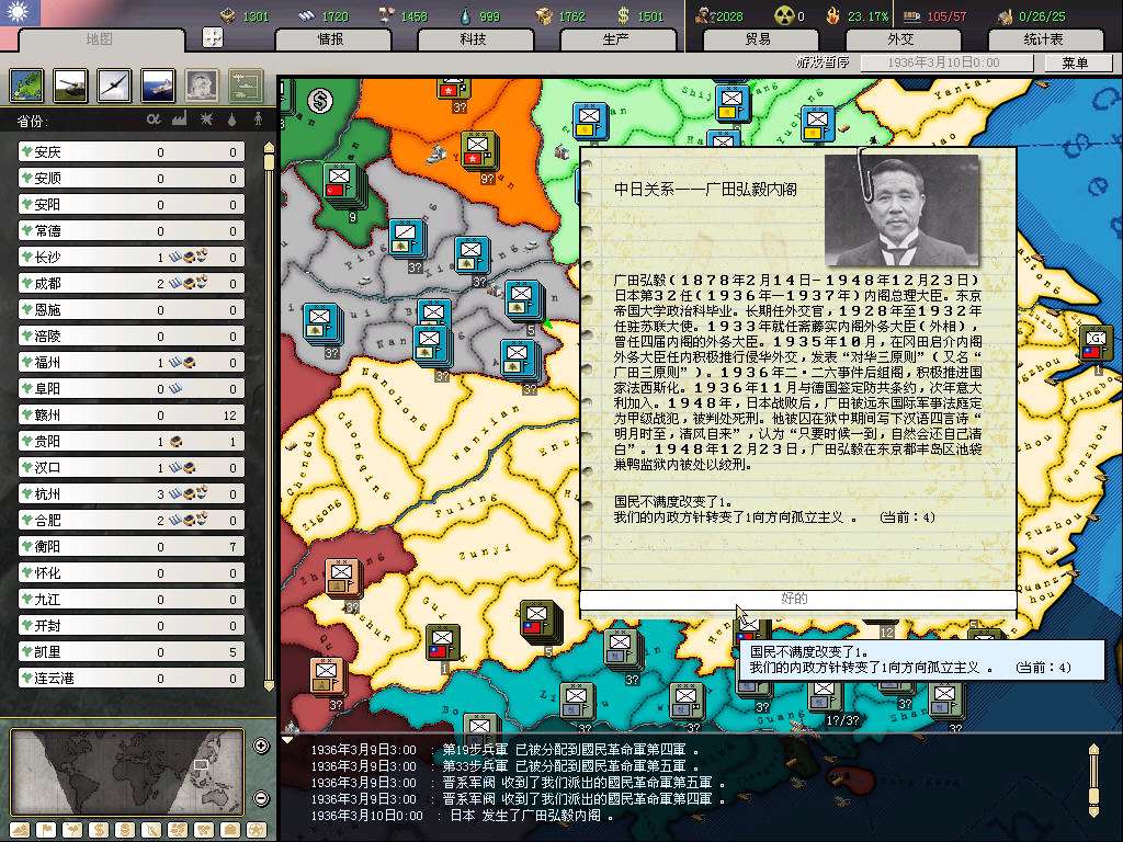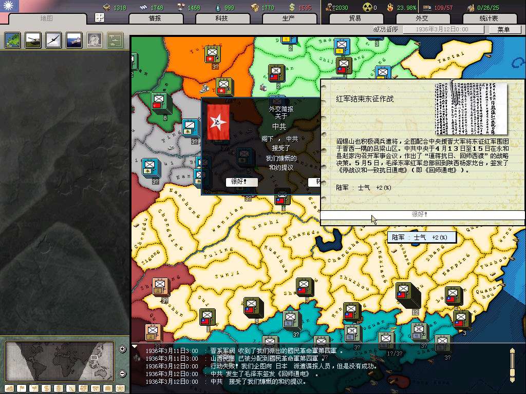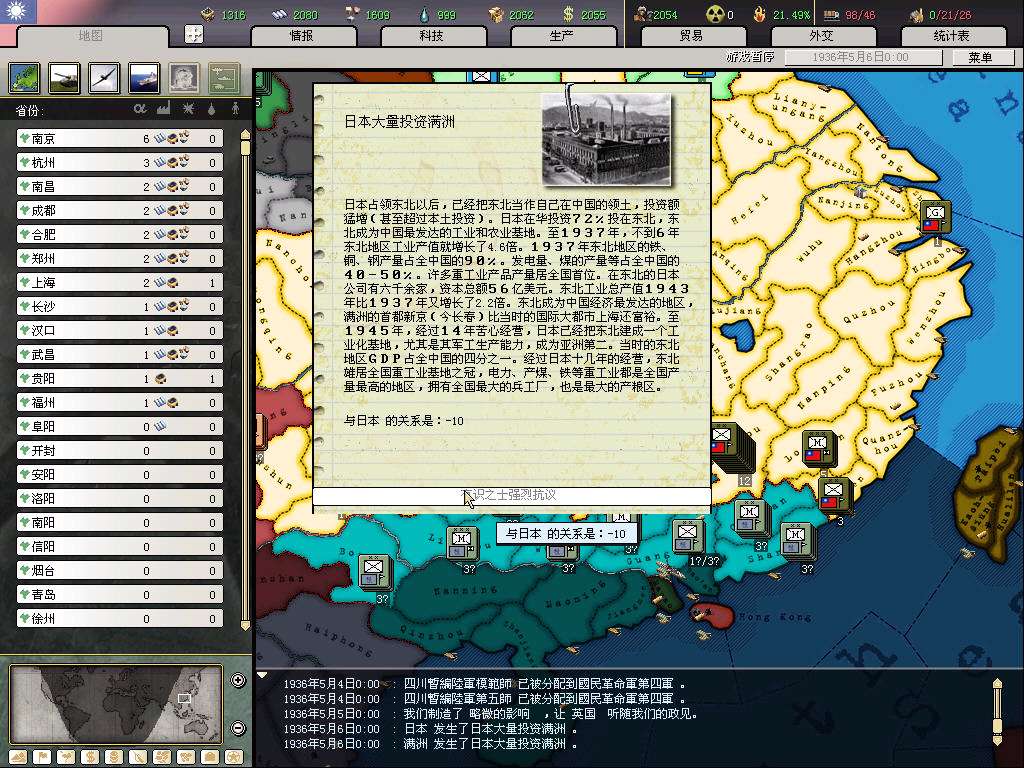 开局打算是攒钱拉英国关系,等和桂系和平后,入盟买图纸(当然运气好的话,资源和图纸也都会很送一些,就更省钱了;这代的图纸太难偷,10个间谍才5%,不抱大腿拿图纸,chi的科技组就是杯具),然后赶在77触发时间结束前(8月底)退盟入中国盟,伟大的抗日战争不容错过,而且这样要完成几个抵抗事件所花的代价也小了。