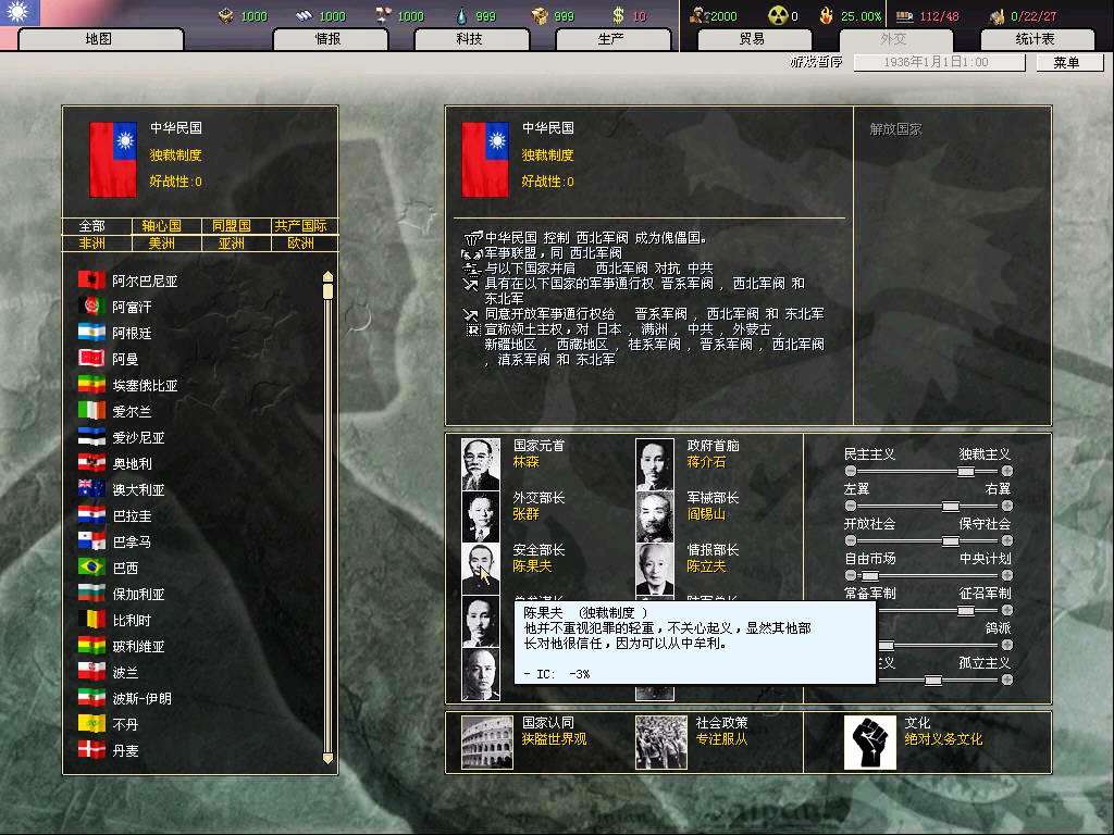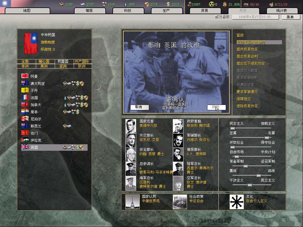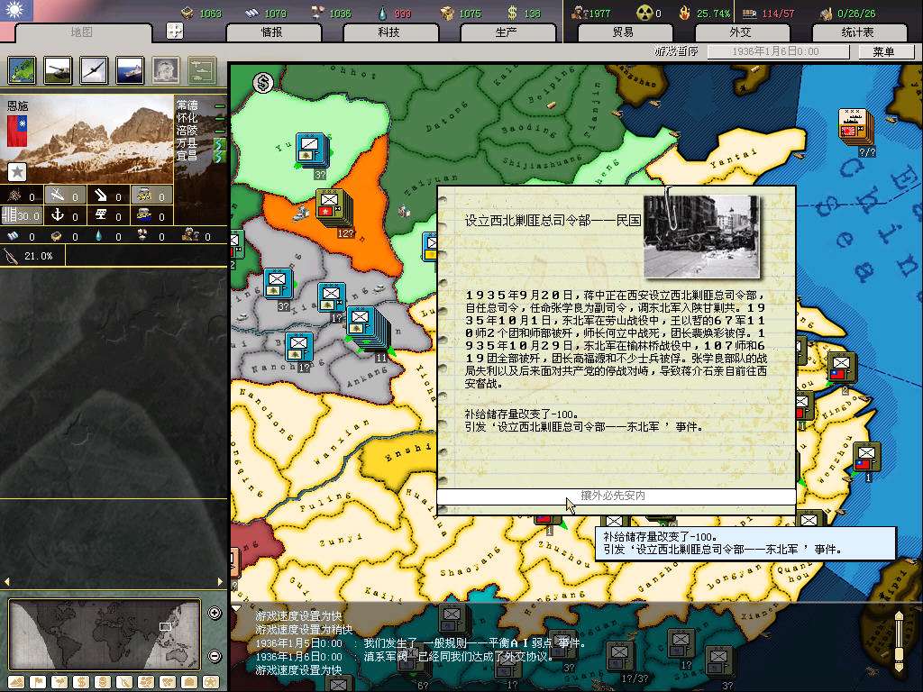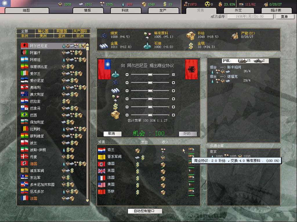 开局打算是攒钱拉英国关系,等和桂系和平后,入盟买图纸(当然运气好的话,资源和图纸也都会很送一些,就更省钱了;这代的图纸太难偷,10个间谍才5%,不抱大腿拿图纸,chi的科技组就是杯具),然后赶在77触发时间结束前(8月底)退盟入中国盟,伟大的抗日战争不容错过,而且这样要完成几个抵抗事件所花的代价也小了。