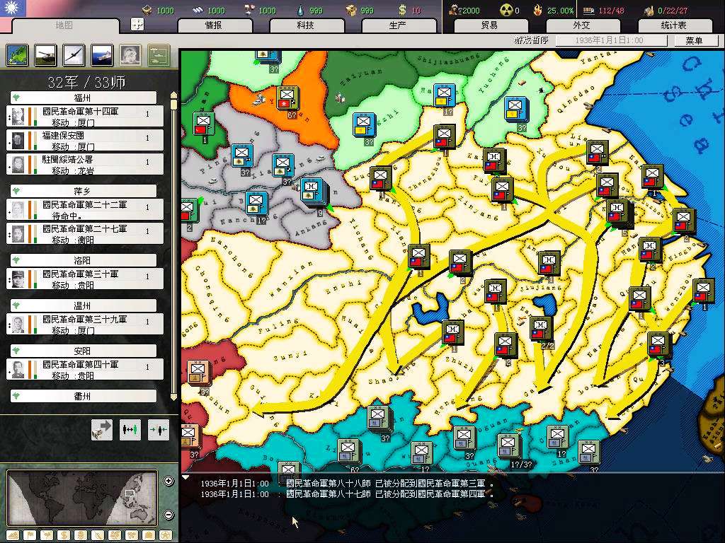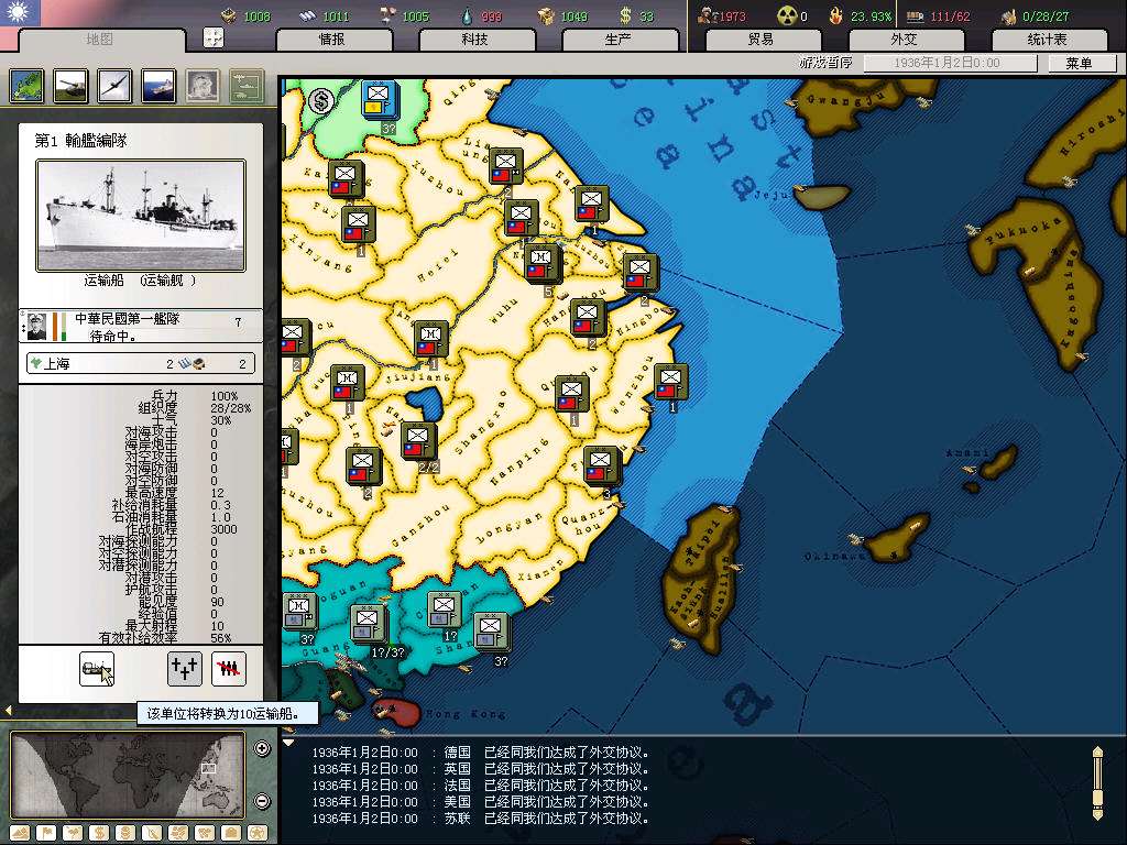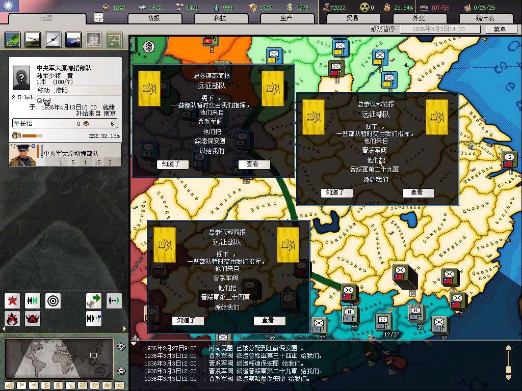 MIH出了新的0.5版本,是基于AOD平台的。照例还是选中国势力,这版红朝所有后门全被堵上,违背历史惩罚太大,要一直熬到皖nan才能独立发展,可玩性太差了,所以华丽地选了国府。统一中国前开吞科技组,小弟里还是有1、2个能用的科技组的,将来能开10洞了还是可以用到的。