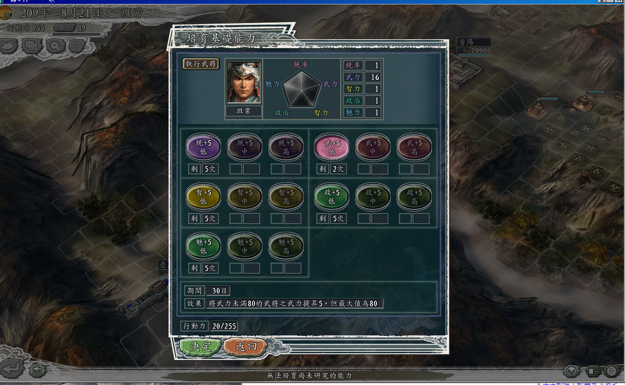 条件:自建武将,武力,智力,统帅,政治,魅力,均为1,技能为空白,各项属性均为C