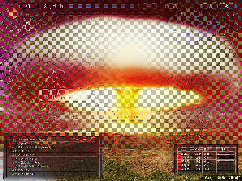 毛泽东、周恩来、邓小平等政治高的几名红军将领执行完探索任务(好在有优化伴侣的多人探索轻松搞定),刚回到瑞金城红军指挥部,早餐没吃上,毛泽东就命令打开军事地图认真查看起来。老毛并不象电视连续剧《长征》里的唐国强一样大腹便便,看上去很干瘦,比邓小平高出一个头。毛泽东在参谋长的帮助下飞快地标出了敌我双方的位置和兵力部署,然后问:“恩来同志,游曦率领的抢占广州市的攻城部队进展如何了?”