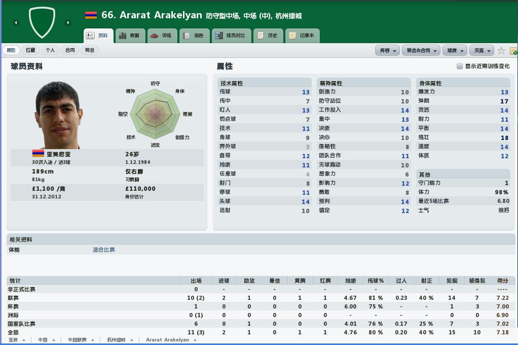 开档就在队里的一个后腰,第一赛季基本打的是预备队。第二赛季一开始球队伤病严重,没办法调上来打了几场,没想到第一场就进球。打了一个赛季,表现很不错!把两个外援挤到板凳上了。