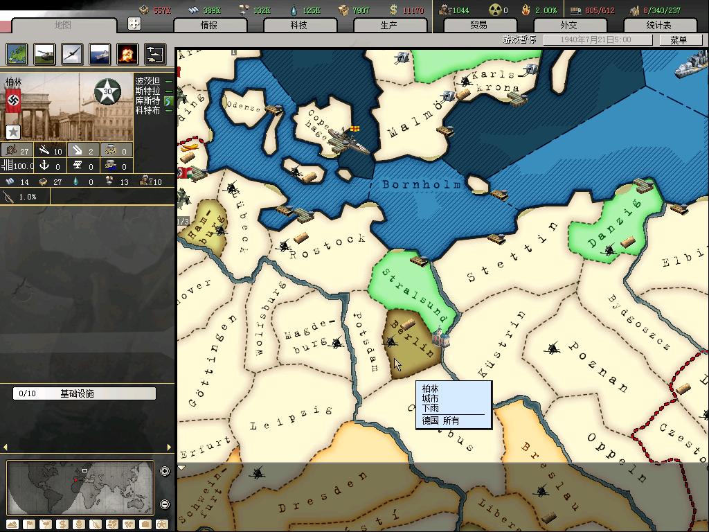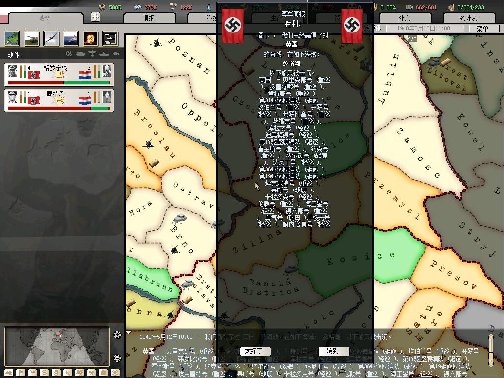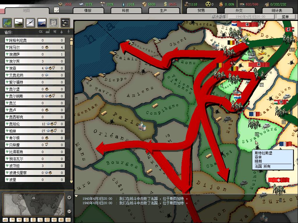 。而其余帝国陆军也都已经集中在了卢森堡和比利时的国境上,在马其诺防线正面的只是柏林要塞和匈牙利的一些27师虚张声势而已。话说这个版本你在慕尼黑即使不放一个兵,AI也不会去占领的(怕被包饺子),并且斯图加特下面两个省没IC没资源没人力,所以放心的让法国去占领吧,也减轻点正面的压力。40.04.03,黄色计划正式打响,虽然提前发动黄色计划会减一格常备,我也没有那些大虾们算的那么准确在这里留有一次拉内政的机会,但这些都不重要,重要的是时间