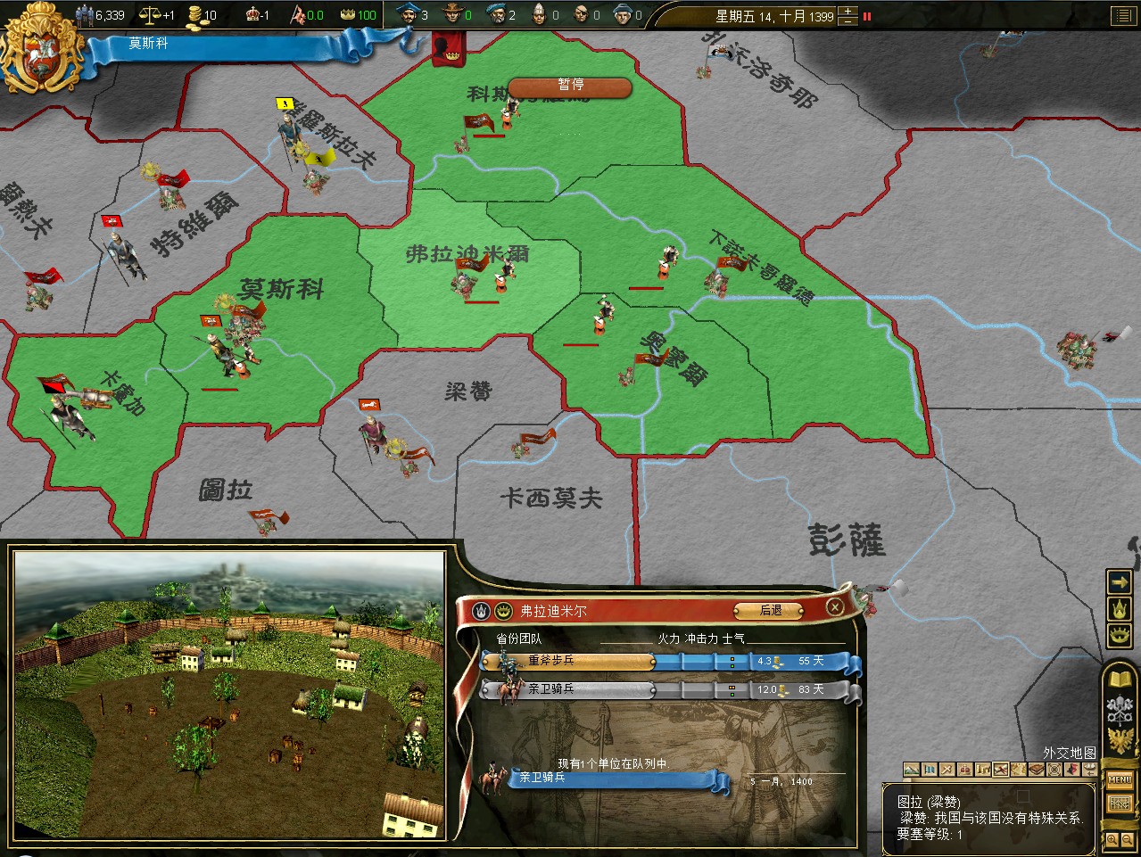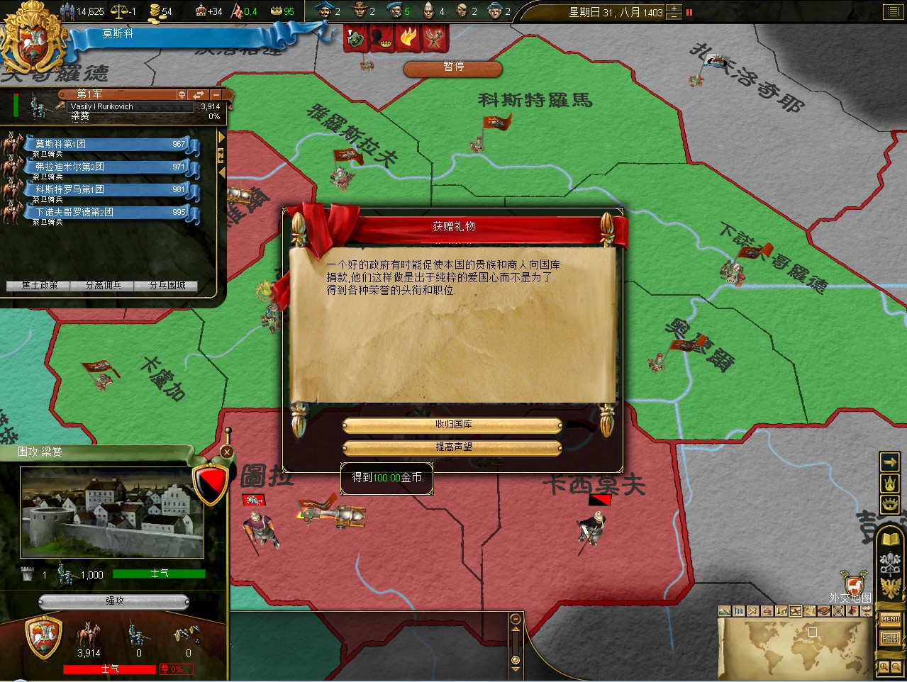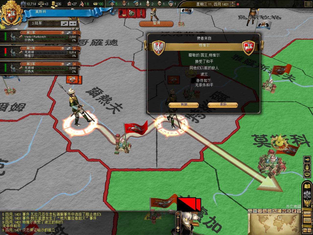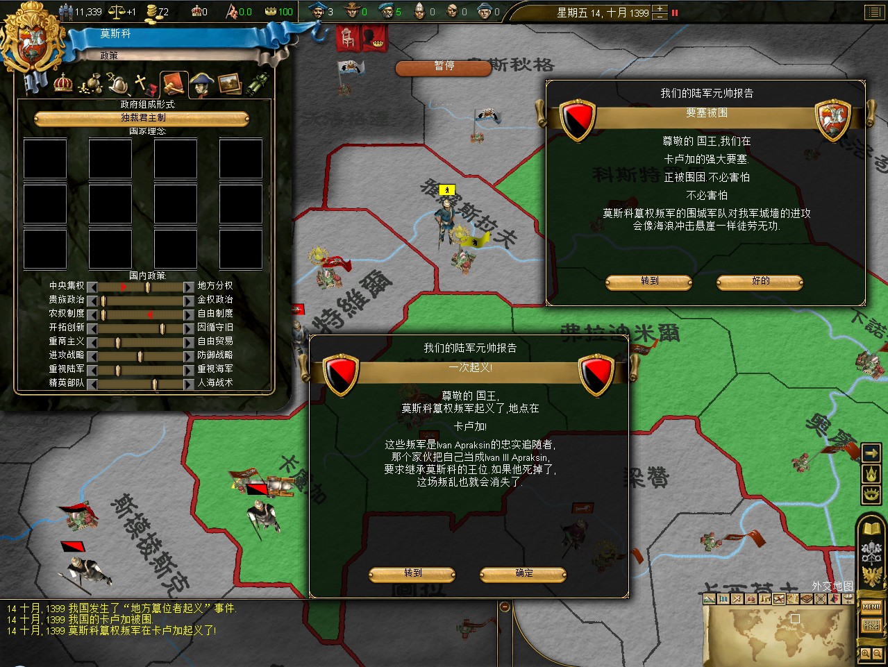开局拉一格中央,其实这是坏习惯,莫斯科初始才5000兵,但如果拉出叛乱在莫斯科,刷出1w3的叛军,可以直接重开了。不过这次运气不错,叛军在卡卢加,还是篡权叛军。这样正好帮我挡住了立陶宛的两股民族主义叛军。民族主义叛军占领后会加十年的民族主义,而篡权叛军没惩罚。